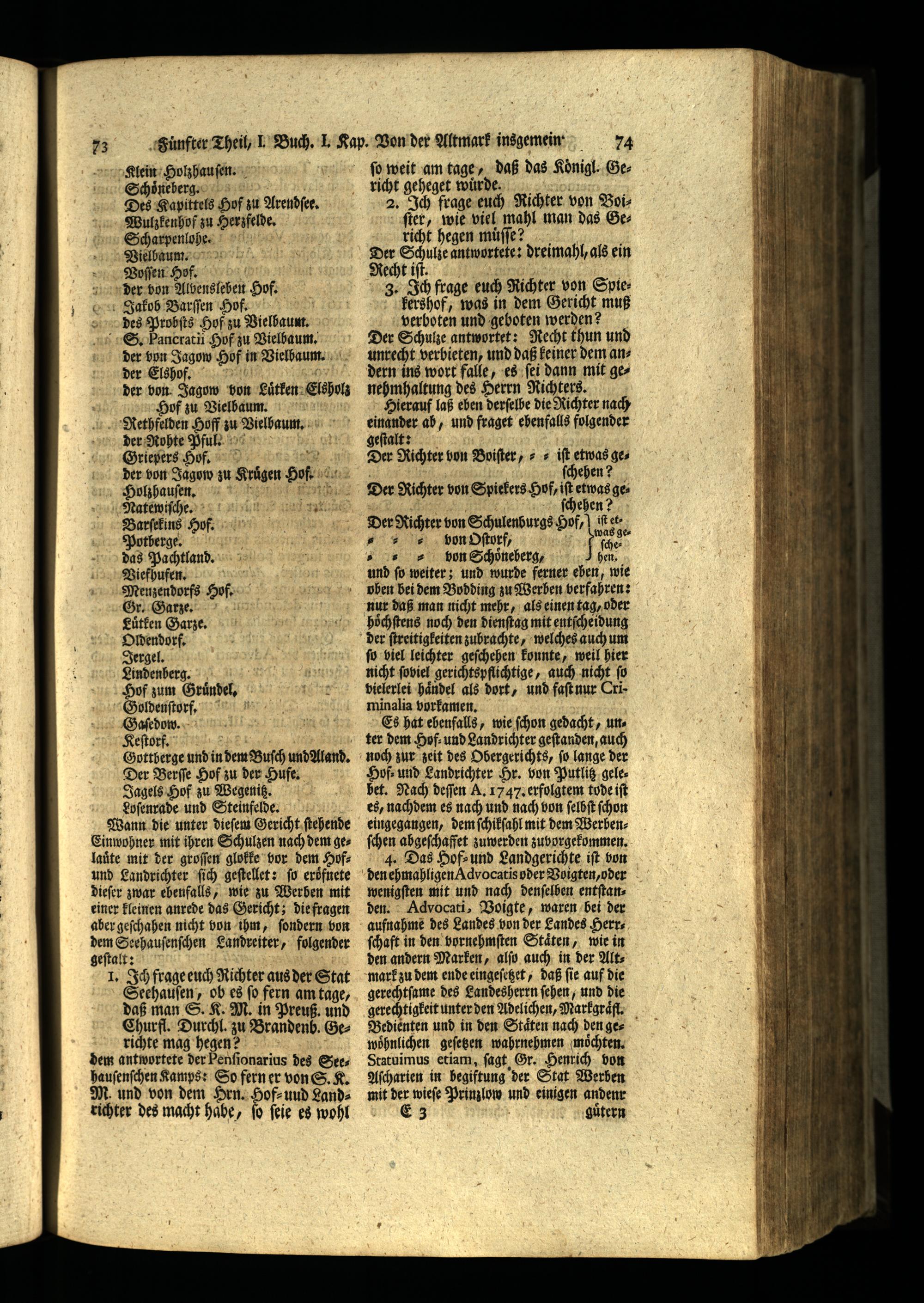 Einwohner mit ihren Schulzen nach dem gelaute mit der groſſen glokke vor dem Hofund Landrichter ſich geſtellet: fü eroͤfnete dieſer zwar ebenfalls, wie zu Werben mit einer kleinen anrede das Gericht; die fragen aber geſchahen nicht von ihm, ſondern von dem Seehauſenſchen Landreiter, folgender geſtalt: