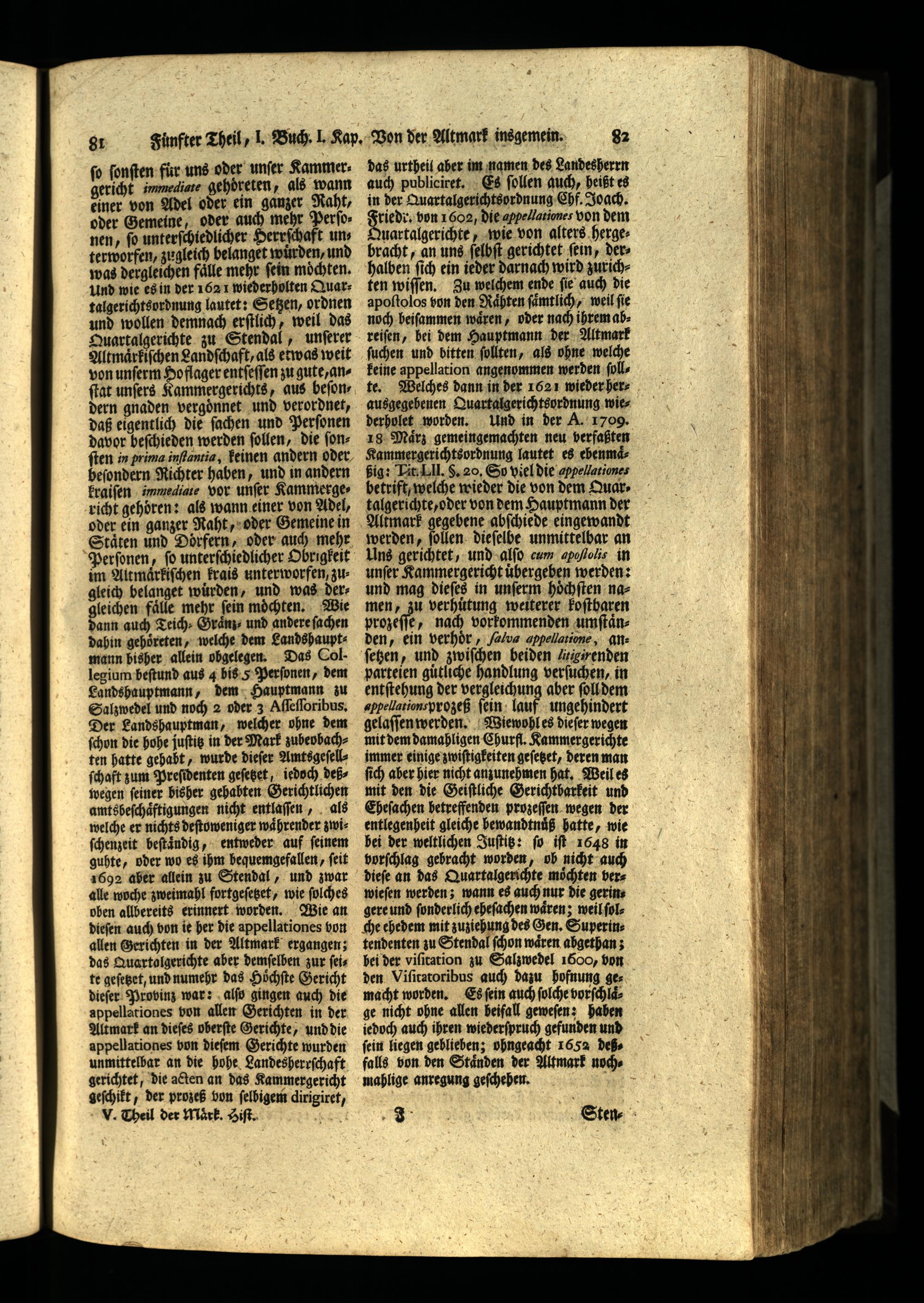 im Altmaͤrkiſchen krais unterworfen zugleich belanget würden, und was dergleichen faͤlle mehr ſein moͤchten. Wie dann auch Teich⸗Graͤn⸗ und andere ſachen dahin gehöoͤreten, welche dem Landshauptmann bisher allein obgelegen. Das Col. legium beſtund aus 4 bis 5 Perſonen, dem Landshauptmann, dem Hauptmann zu Salzwedel und noch 2 oder 3 Aſſeſſoribus. Der Landshauptman, welcher ohne dem ſchon die hohe juſtit in der Mark zubeobachten hatte gehabt, wurde dieſer Amtsgeſellſchaft zum Preſidenten geſetzet iedoch deßwegen feiner bisher gehabten Gerichtlichen amtsbeſchaͤftigungen nicht entlaſſen, als welche er nichts deſtoweniger waͤhrender zwiſchenzeit beſtaͤndig, entweder auf feinem guhte, oder wo es ihm bequemgefallen, ſeit 1692 aber allein zu Stendal, und zwar alle woche zweimahl fortgeſetzet, wie ſolches oben allbereits erinnert worden. Wie an dieſen auch von ie her die appellationes von allen Gerichten in der Altmark ergangen; das Quartalgerichte aber demſelben zur ſeite geſetzet, und numehr das Hoͤchſte Gericht dieſer Provinz war: alſo gingen auch die appellationes von allen Gerichten in der Altmark an dieſes oberſte Gerichte, und die appellationes von dieſem Gerichte wurden unmittelbar an die hohe Landesherrſchaft gerichtet, die acten an das Kammergericht geſchikt, der prozeß von ſelbigem dirigiret,