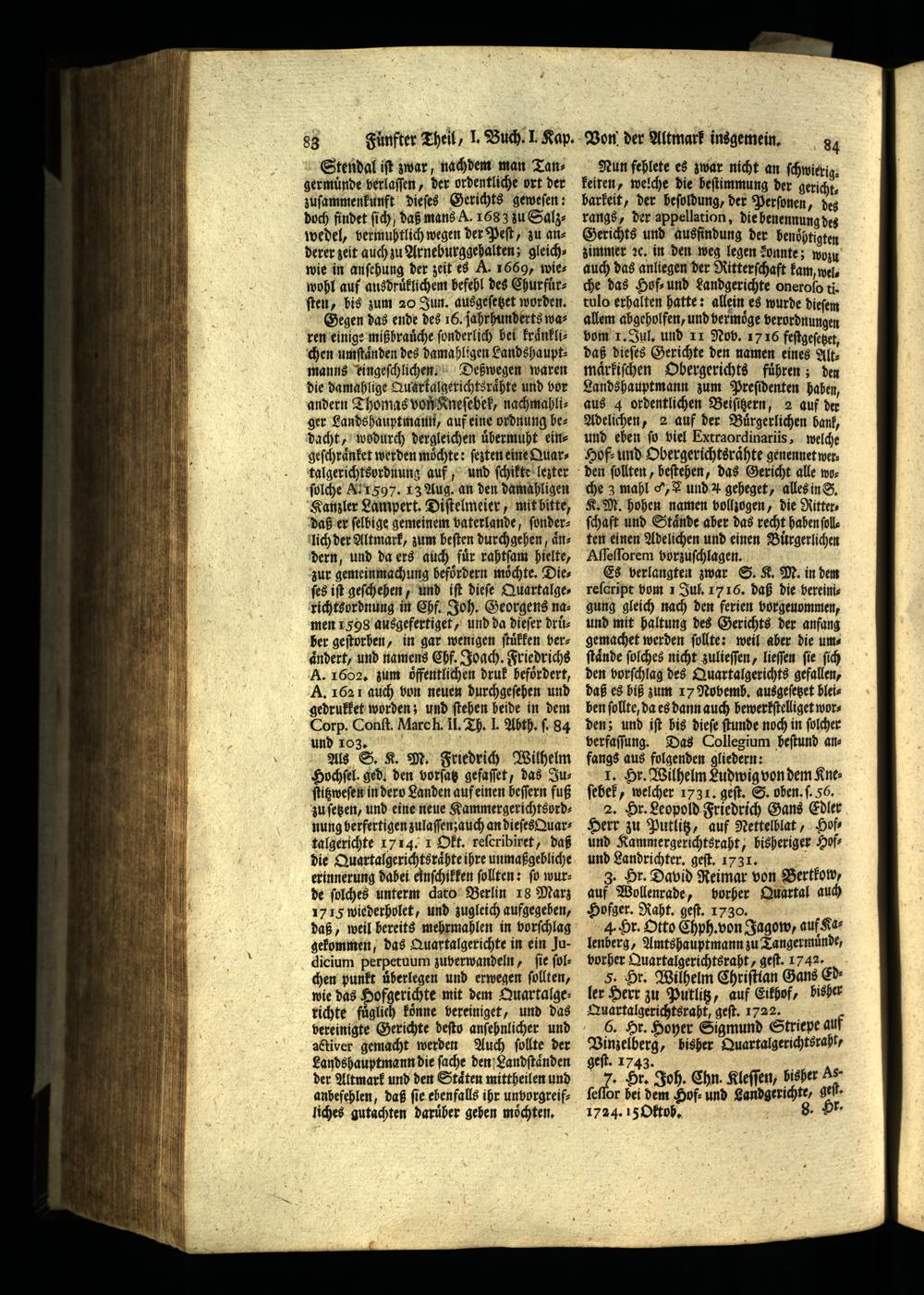 Gegen das ende des 16. jahrhunderts waren einige mißbrauͤche ſonderlich bei kraͤnklichen umſtaͤnden des damahligen Landshauptmanns kingeſchlichen Deßwegen waren die damahlige Quartalgerichtsrauͤhte und vor andern Thomas von Kneſebek, nachmahliger Landshauytmann, auf eine ordnung bedacht, wodurch dergleichen uͤbermuht eingeſchraͤnket werden möchte: ſezten eine Quartalgerichtsyrdnung auf, und ſchikte lezter ſolche MI 597. 13 Aug. an den damahligen Kanzler Lampert. Diſtelmeier, mit bitte, daß er ſelbige gemeinem vaterlande, ſonderlich der Altmark, zum beſten durchgehen, aͤndern, und da ers auch fuͤr rahtſam hielte, zur gemeinmachung befördern möchte, Dies ſes iſt geſchehen, und iſt dieſe Quartalgerichtsordnung in Chf. Joh. Georgens namen 1598 ausgefertiget, und da dieſer druber geſtorben, in gar wenigen ſtuͤkken verÄndert, und namens Chf. Joach. Friedrichs A. 1602. zum oͤffentlichen druk befoͤrdert, A. 1621 auch vun neuen durchgeſehen und gedrukket worden; und ſtehen beide in dem Corp. Conſt. Mare h. Il. Th. J. Abth. ſ. 84 und 103. ö.