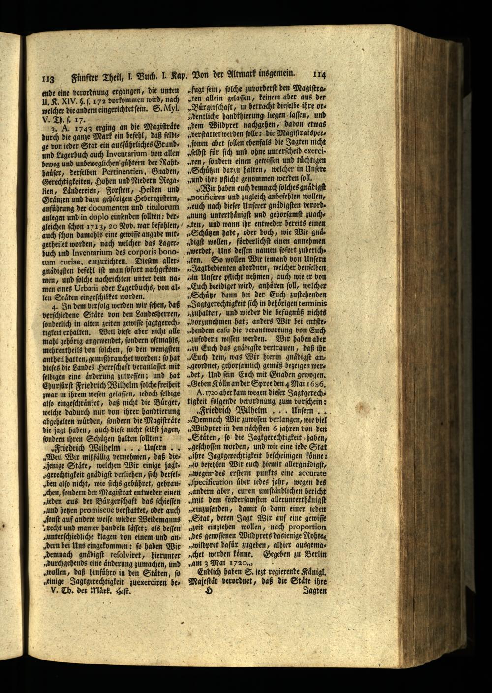 4. In dem verfolg werden wir ſehen, daß verſchiedene Staͤte von den Landesherren, ſonderlich in alten zeiten gewiſſe jagtgerechtigkeit erhalten. Weil dieſe aber nicht alle mahl gehörig angewendet, ſondern oftmahls, mehrentheils von ſolchen, ſo den wenigſten antheil hatten, gemißbrauchet worden: ſo hat dieſes die Landes Herrſchaft veranlaſſet mit ſelbigen eine aͤnderung zutreffen; und hat Churfuͤrſt Friedrich Wilhelm ſolche freiheit zwar in ihrem weſen gelaſſen, iedoch ſelbige alſo eingeſchraͤnket, daß nicht die Bürger, welche dadurch nur von ihrer handtierung abgehalten wuͤrden, ſondern die Magiſtraͤte die jagt haben, auch dieſe nicht ſelbſt jagen, ſondern ihren Schuͤtzen halten ſollten: