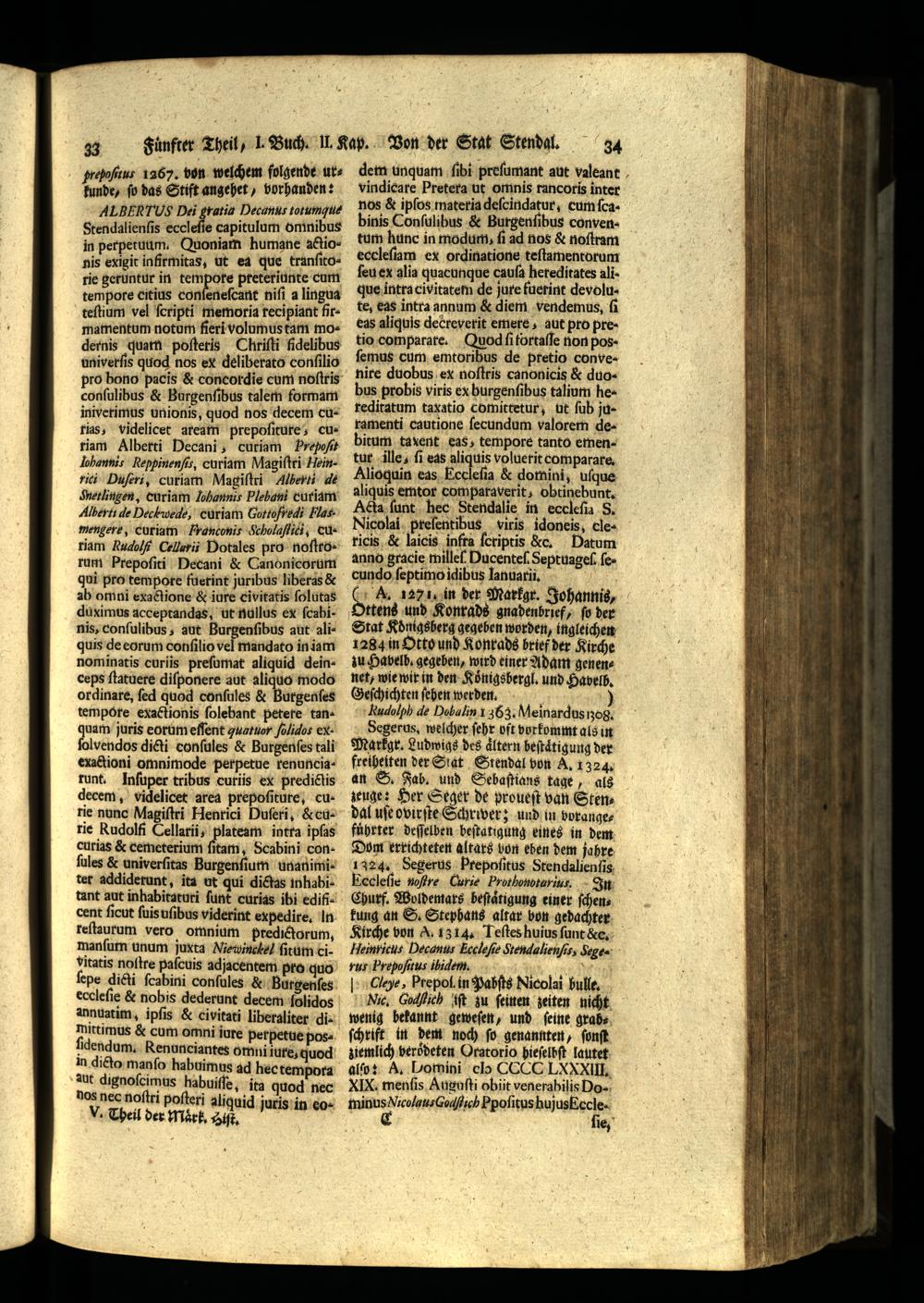 ALBERTUS Dei gratis Hecanus totumquts Stendalienſis eccleſſe capitulum omnibus in perpetuum. Quoniam humane aclio6 nis exigit infirmitas, ut ea que tranſitorie geruntur in tempore preteriunte cum tempore citius conſeneſcant niſi a lingua teſtium vel ſcripti memoria recipiant firmamentum notum fieri volumus tam modernis quam poſteris Chriſti fidelibus univerſis quod nos ex deliberato conſilio pro bono pacis& concordie cum noſtris conſulibhus& Burgenſibus talem formam iniverimus unionis, quod nos decem cu tias, videlicet aream prepoſiture, curiam Alberti Decani, curiam Prepoſit lobannis Reppinenſis, curiam Magiſtri Hinrici Duſcri, curiam Magiſtri Alberti de Metlingen, curiam Zobannis Plebani curiam Albertus de Deckwede,' curiam Goto fredi Hass mengert, curiam Hranconis cholaſtici, Cu
