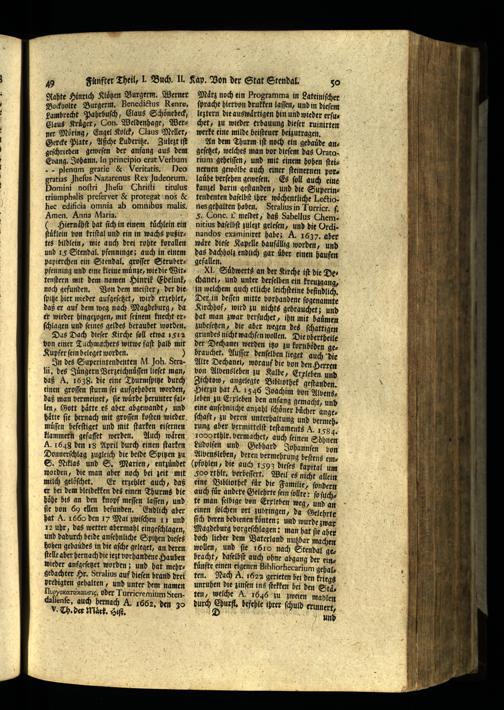 doch lieber dem Vaterland nutzbar machen wollen, und fie 1610 nach Stendal gebracht, daſelbſt auch ohne abgang der einkuͤnfte einen eigenen Bihliothecarium gehalten. Nach A. 1622 gerieten hei den kriegs unruhen die zinſen ins ſtekken bei den Sta, durch SH hefehle ihrer ſchuld erinnert,
