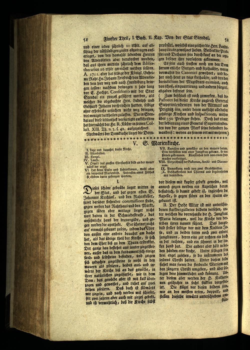 und einer ieden jaͤhrlich 10 rthlr. auf abſchlag der ruͤlſtaͤndigen zinſen abzutragen auferleget, von den damahls lebenden Herren von Alvensleben aber verabredet worden, daß aus ihren mitteln jaͤhrlich dem Bibliothecarius 16 rthlr gereichet werden ſollten. A. 1711. aber hat ſelbige der Koͤnigl. Geheime Raht Hr. Johann Friedrich von Alvensleben von hier weg nnd nach Hundsburg bringen laſſen: nachdem deswegen 8 jahr lang vor E. Hochpr. Conſiſtorio mit der Stat Stendal ein prozeß gefuͤhret worden, als welcher die obgedachte Hrn. Ludolph und Gebhard Johann verſprochen hatten, ſelbige phne erhebliche urſachen nicht weg bringen, viel weniger bertheilen zulaſſen. Die in Stendal auf dieſe bibliothek verfertigte aufſchriſten hat hiernaͤchſt der Hr. R. Kuͤſter in feinen Colject. XIII. Th. n. 3. ſ. 42. aufgezeichnet. Nordwaͤrtd der Domkirche lieget die Dom