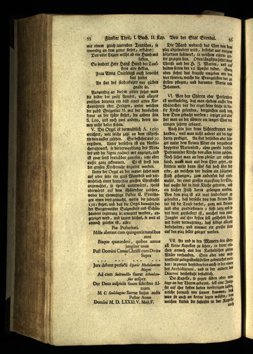 VI. Von den Chören oder Porleuben iſt merkwuͤrdig, daß man ehedem auſſer dem ſchuͤlerchor vor der orgel keine ſolche in die: fer Kirche gefunden, dergleichen auch von dem Dom gedacht worden: ietziger zeit aher hat man an der ſuͤdſeite ein langes Chor vor einigen jahren erbauet..