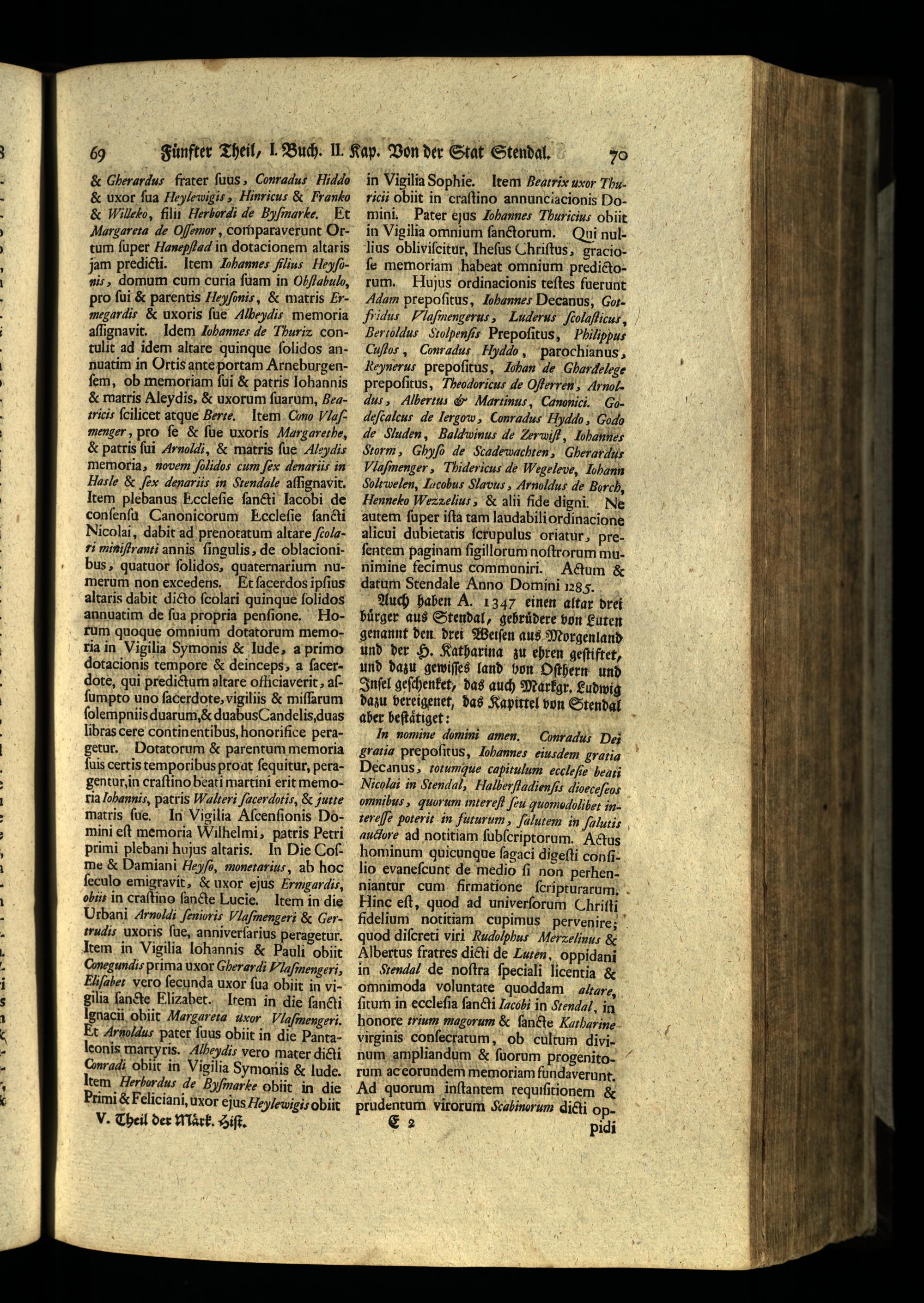 & Ghrrardur frater ſuus, Conradus Hiddo & uxor ſua Heylenvigit, Hinricus& Franko & Willeko, filij Herbordi de Byfmarke. Et Margareta de Oſſemor, comparaverunt Ortum ſuper Hancpſlad in dotacionem altaris jam predicti. Item Zohannes filius Heyfonit, domum cum curia ſuam in Ohſlabuls, pro ſui& parentis Heyfonis,& matris Hrmegardic& uxoris ſue Albeyjdi memoria aſſignavit. Idem Zohannes de Thuriz contulit ad idem altare quinque ſolidos annuatim in Ortis ante portam Arneburgenſem, ob memoriam ſui& patris lohannis & matris Aleydis,& uxorum ſuarum, Bedtricis ſcilicet atque Berte. Item Cono HaſC menger, pro fe& ſue uxoris Margarethe, & patris ſui Arnoldi,& matris ſue Aleydi-s memoria, novem ſolidos cum(ex denarüs in Hasle& fex denariis in Frendale aſſignavit. Item plebanus ecleſie ſancti Iacobi de conſenſu Canonicorum Eccleſie ſancti Nicolai, dabit ad prenotatum altare ſcolaJi miniſtranti annis ſingulis, de oblacioni. bus, quatuor ſolidos, quaternarium numerum non excedens. Et ſacerdos ipſius altaris dabit dicto ſcolari quinque ſolidos annuatim de ſua propria penſione. Horum quoque omnium dotatorum memoria in Vigilia Symonis& lude, a primo dotacionis tempore& deinceps, a ſacerdote, qui predictum altare officiaverit, aſſumpto uno ſacerdote, vigiliis& miſſarum ſolempniis duarum,& duabus Candelis duas libras cere continentibus, honorifice peragetur. Dotatorum& parentum memoria ſuis certis temporibus proat ſequitur, peragentur, in craſtino beati martini erit memoria lohannis, patris Walteri ſuterdotis,& jutte matris ſue. In Vigilia Aſcenſionis Domini eſt memoria Wilhelmi, patris Petri primi plebani hujus altaris. In Die Coſme& Damiani Heyſs, monetarius, ab hoc ſeculo emigravit,& uxor ejus Ermgardis, obsis in craſtino ſancte Lucie. Item in die Urbani Arnoldi ſenioris Vlafmengeri& Gertrudis uxoris ſue, anniverſarius peragetur. Item in Vigilia lohannis& Pauli obiit Conegundis prima uxor Gherardi Hlaſmengeri, Elifabet vero ſecunda uxor{ua obiit in vigilia lancte Elizabet., Item in die ſanqi gnacii ohiit Margareta ÜXor V lafmengeri, Er Arpoldus pater ſuns ohiit in die Pantaleonis martyris. Alheydis vero mater icti Cnradi obiit in Vigilia Symonis& lude. Item Herbordus de Byfmarke ohiit in dic krimi& Feliciani, uxor ejus Heylewigis obiit V. Theil der Mark. Hiſt.