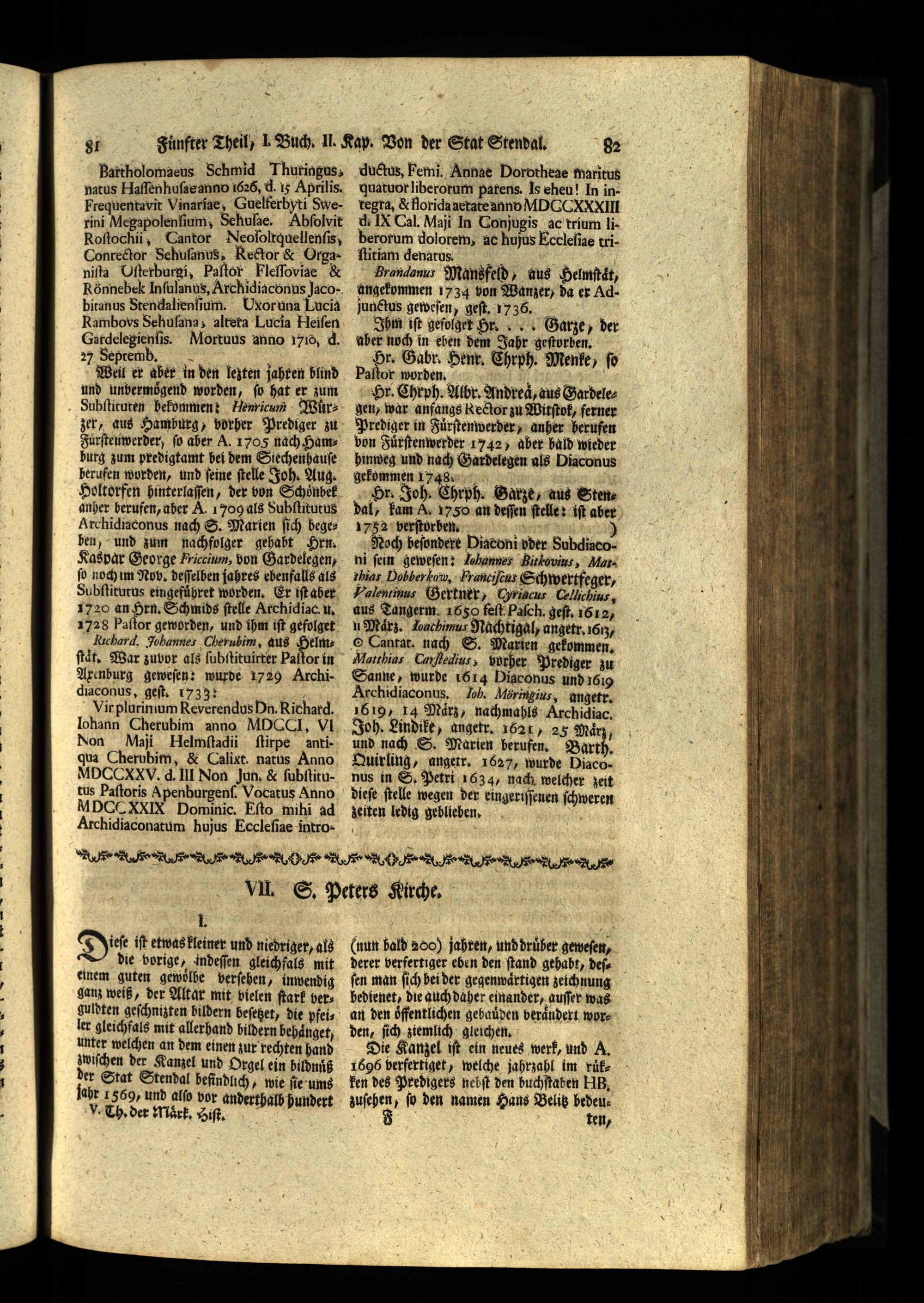 Vir plurimum Reverendus Pn. Richard. lohann Cherubim anno MDCGCI, VI Non Maji Helmſtadii ſtirpe antiqua Cherubim,& Calixt. natus Anno MDCC XXV. d. Ill Non Jun.& ſubſtitutus Paſtoris Apenburgenſ. Vocatus Anno M Doc XXIX Dominic. Eſto mihi ad Archidiaconatum hujus Eccleſiae intro