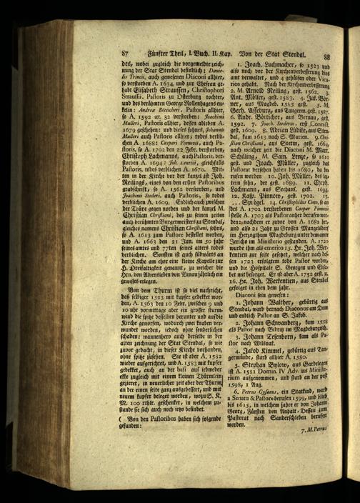 6. Petrus-Gyfaeus, ein Statkind, ward a Senatu& Paſfore berufen 1599, und hlieh, bis 1615, in welchem jahre er von Johann Georg, Fuͤrſten von Anhalt-Deſſau zum Paſtorat nach Sanderſchleben berufen