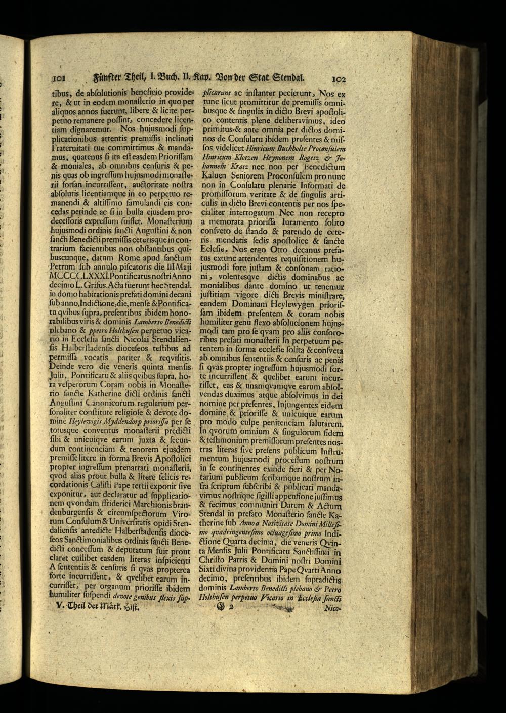 plicarunt ac inſtanter pecierunt, Nos ex tunc ſicut promittitur de premiſſis omnibusque& ſingulis in dicto Breyi apoſtolico contentis plene deliberavimus, ideo primitus& ante omnia per dictos dominos de Conſulatu ibidem preſentes& miſ{os videlicet Hinricum Buckholte proconſulem Iinricum RKlutzen Heynonem Regerz& Jokanneim Kratz nec non per Henedictum Kaluen Seniorem Proconſulem pro nunc non in Conſulatu plenarie Informati de promiſſorum veritate& de ſingulis articulis in di&o Brevi contentis per nos ſpecialiter interrogatum Nec non recepto a memorata prioriſſa luramento ſolito conſueto de ſtando& parendo de ceteris mendatis ſedis apoſtolice& ſancte Ecleſie, Nos ergo Otto decanus prefatus extunc attendentes requiſitionem hujusmodi fore juſtam& conſonam rationi, volentesque dictis dominabus ac monialibus dante domino ut tenemur juſtitiam vigore dicti Brevis miniſtrare, eandem Dominam Heylenygen prioriſſam ihidem preſentem& coram nobis humiliter genu flexo abſolucionem hujusmodi tam pro fe quam pro aliis conſororihus prefari monafterii In perpetuum petentem in forma eccleſie ſolita& conſveta ab omnibus ſententiis& enſuris ac penis fi qvas propter ingreſſum hujusmodf forte incurriſſent& quelibet earum incurriſſet, eas& unamqvamqve earum abſolvendas duximus atque abſolvimus in dei nomine per preſentes, Injungentes eidem domine& prioriſſe& unichique earum pro modo culpe penitenciam ſalutarem. In quorum omnium& ſingulorum fidem &teſtimonium premiſſorum preſentes nostras literas five preſens puhlicum Inſtrumentum hujusmodi proceſſum noſtrum in fe continentes exinde fieri& per Notarium publicum ſcribamque noſtrum infra ſcriptum ſubſeribi& publicari mandavimus noſtrique ſigilli appenfione juſſimus & fecimus communiri Datum& Actum Stendal in prefato Monaſterio ſancte Katherine lub Anno Nativirate Domini Millefimo Juadringenteſimo octudgeſimo primo IndiClione Qarta decima, die veneris Quinta Menſis Juli Ponrificatu Sanctiſſim in Chriſto Patris& Domini noſtri Domini Sixti divina providentia Pape Qvarti Anno decimo, preſentihus ibidem ſupradictis dominis Lamherto Henediczi plebano& Peng Hollhuſen perpetuo Hicaris in Eeclefa fand