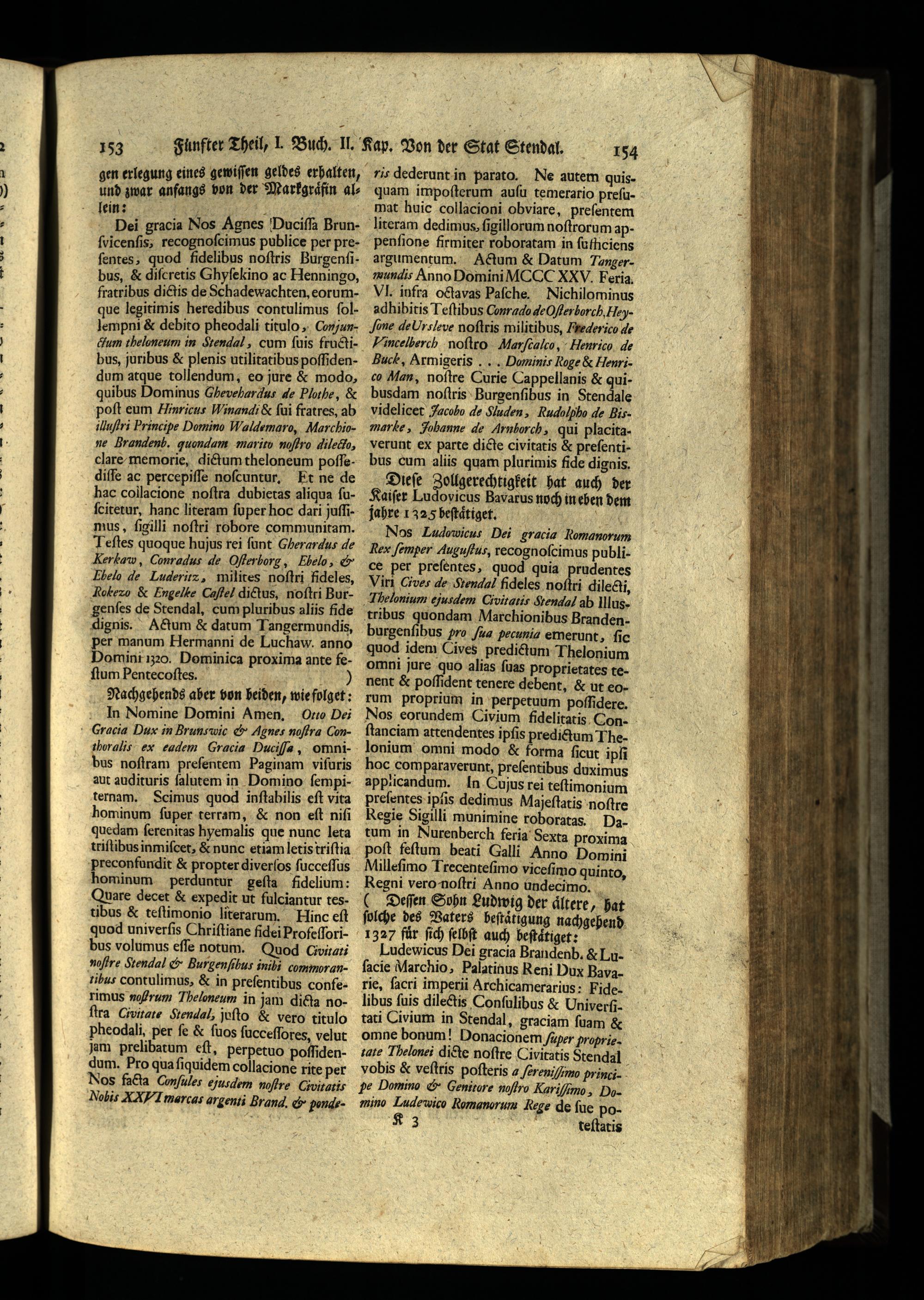 ris dederunt.in parato. Ne autem quisquam impoſterum auſu temerario preſumat huic collacioni obviare, preſentem literam dedimus, ſigillorum noſtrorum appenſione firmiter roboratam in ſufhiciens argumentum. Actum& Datum Toungerwundis Anno Domini MCCC XXV. Feria Vl. infra octavas Paſche. Nichilominus adhibitis Teſtibus Conrado de O ler horch. Heyone deUrsleve noftris militibus, Ftederico de Vincelberch noſtro. Marftalco, Henrico de Buck, Armigeris. Domini Roge& Henrico Man, noſtre Curie Cappellanis& quibusdam noſtris Burgenſibus in Stendale videlicet Jacobo de Sluden, Rudolpho de Bismarke, Jhhanne de Arnborch, qui placitaverunt ex parte dicte civitatis& preſentibus cum aliis quam plurimis fide dignis. Dieſe Zollgerechtigkeit hat auch der Kaiſer Ludovicus Bavarus noch in eben dem jahre 1 3235 beſtaͤtiget.. Nos Ludomuicus Dei gracia Romanorum Rex femper Augufus, recognoſcimus publice per prefentes, quod quia prudentes Viri Cives de Stendal fideles noſtri dilecti, ‚Thelonium ejusdem Civitatis Stendal ab Illustribus quondam Marchionibus Brandenburgenſihus pro ſua pecunis emerunt, ſic quod idem Cives predictum Thelonium omni jure quo alias ſuas proprietates tenent& poſſident tenere debent,& ut erum proprium in perpetuum poſſidere. Nos eorundem Civium ſfidelitatis Conſtanciam attendentes ipſis predictum Thelonium omni modo& forma ſicur ipſi hoc comparaverunt, preſentibus quximus applicandum. In Cujus rei teſtimonium preſentes ipſis dedimus Majeſtatis noſtre Regie Sigilli munimine roboratas, Datum in Nurenberch feria Sexta proxima poſt feſtum beati Galli Anno Domini Milleſimo Trecenteſimo viceſimo quinto, Regni vero noſtri Anno undecimg. ö Deſſen Sohn Ludwig der aͤltere, hat ſolche des Vaters heſtaͤtigung nachgehend 1327 für ſich ſelbſt auch beſtaͤtiget: Ludewicus Dei gracia Brandenb.&; Lu. ſacie Marchio, Palatinus Reni Dux Bavarie, ſacri imperii Archicamerarius: Fidelibus ſuis dilectis Conſulibus& Univertati Civium in Stendal, graciam ſuam& omne bonum! Honacionem füper Proprie. tat Thelonei dicte noſtre Civitatis Stendal vobis& veſtris poſteris a ſereniſmo princi.