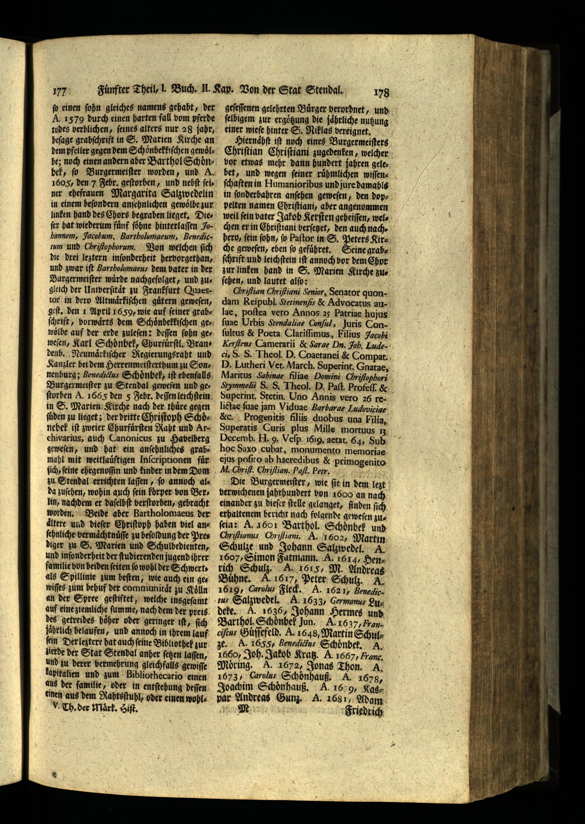 geſeſſenen gelehrten Bürger verordnet, und ſelbigem zur ergötzung die jaͤhrliche nutzung einer wieſe hinter S. Niklas vereignet. Hiernaͤhſt iſt noch eines Burgermeiſters Chriſtian Chriſtiani zugedenken, welcher bor etwas mehr dann hundert jahren gelebet, und wegen ſeiner ruͤhmlichen wiſſenſchaften in Numanioribus und jure damahls in ſonderbahren anſehen geweſen, den doppelten namen Chriſtiani, aher angenommen weil fein vater Jakob Kerſten geheiſſen, wel chen er in Chriſtiani verſetzet, den auch nach hero, fein ſohn, ſo Paſtor in S. Peters Kirche geweſen, eben fo gefuͤhret. Seine grab ſchrift und leichſtein iſt annoch vor dem Chor zur linken hand in S. Marien Kirche zus. ſehen, und lautet alſp:. Chriſian Chriſtiani Senior, Senator quondam Reipubl. Sretinenſis& Advocatus aulae, poſtea vero Annos 25 Patriae hujus ſuae Urbis Grendaliae Cenſul, juris Conſultus& Poeta Clariſſimus, Filius Jacobs Ker ſten Camerarii& Sarae Dn. Joh. Ludeci.&. S. Theol. D. Coaetanei& Compat. D. Lutheri Vet. March. Superint. Gnatae, Maritus Sabinae fila Domini Chrifßophori: Stymmelii S. S. Theol. D. Paſt. Profeſſ.& dSuperint. Stetin Uno Annis vero 26 reliclae ſuae jam Viduae Barbara Ludoviciae: c. Progenitis fils duobus una Filia, Superatis Curis plus Mille mortuus n Decemb. H. 9. Veſp 1i6i9, aetat. 64; Sub hoc Saxo cubat, monumento memoriae ejus poſito ab haeredibus& primogenito