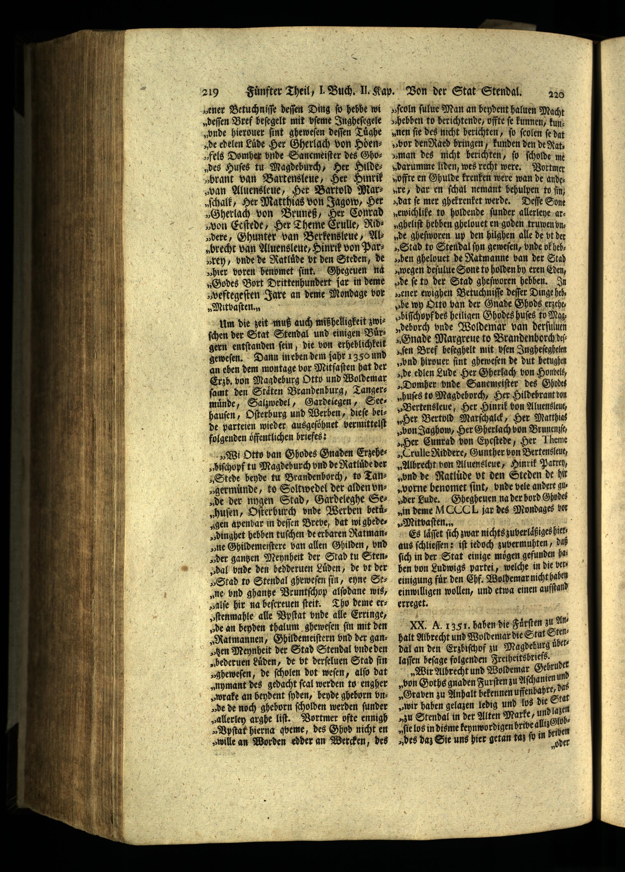 XX. A. 1351. haben die Fuͤrſten zu Anhalt Albrecht und Woldemar die Stat Sten dal an den Erzbiſchof zu Magdeburg über‘ laſſen beſage folgenden Freiheit sbriefs.