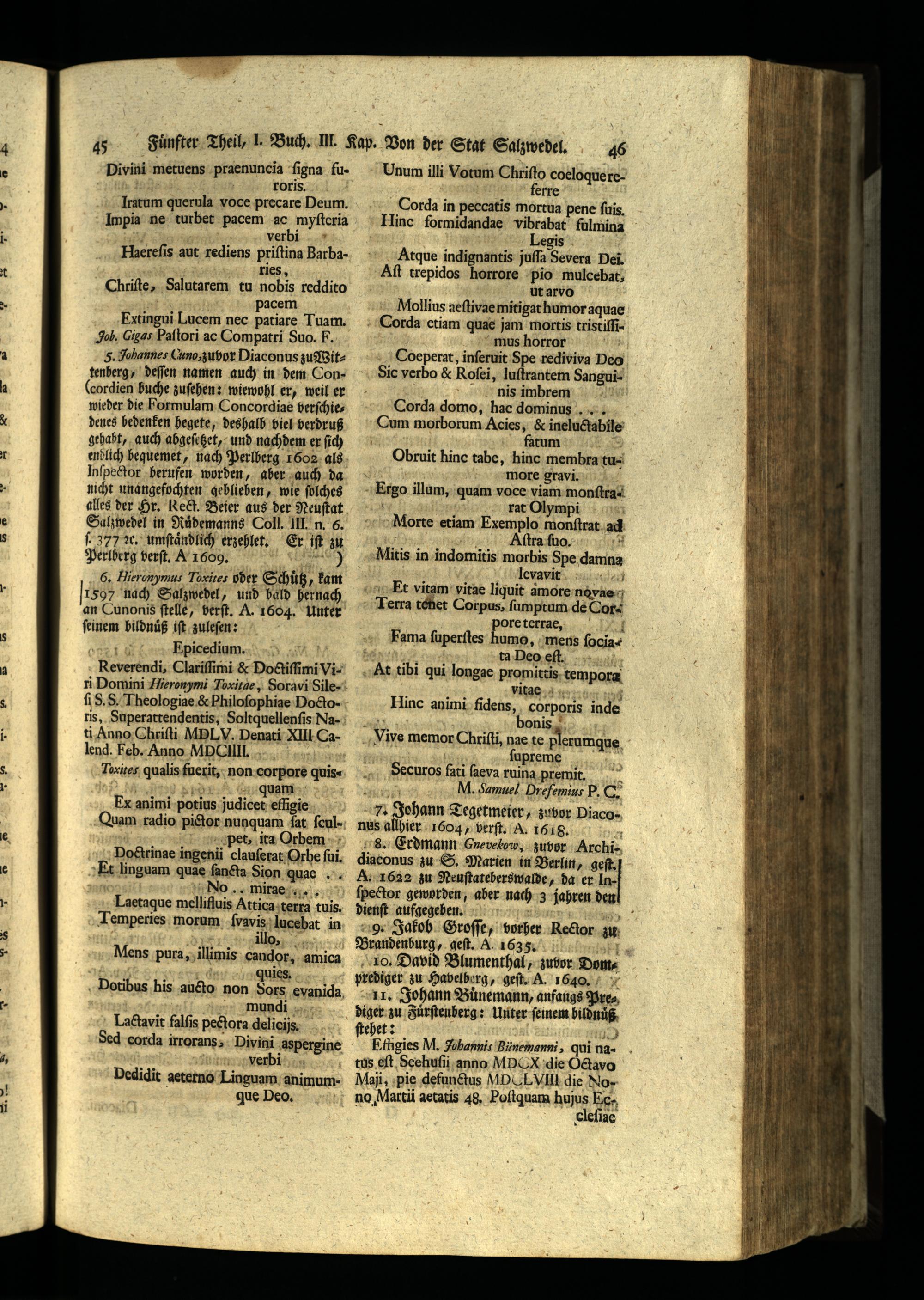 A— verbi Haereſis aut rediens priſtina Barbaries, Chriſte, Salutarem tu nobis reddito t pacem Entingui Lucem nec patiare Tuam. Job. Gigas Paſtori ac Compatri Suo. F. S5. Johannes(uno, zubor Diaconus zu Wittenberg, deſſen namen auch in dem Con(cordien buche zuſehen: wiewohl er, weil er wieder die Formulam Concordiae verſchiedenes bedenken hegete, deshalb viel verdruß gehabt, auch abgeſttzet, und nachdem er ſich endlich hegzuemet, nach Perlberg 1602 als Inſpector berufen worden, aber auch da nicht unangefochten geblieben, wie ſolches alles der Hr. Keck. Beier aus der Neuſtat Salzwedel in Ruͤdemanns Coll. III. n. 6. 377 ꝛc. umſtaͤndlich erzehlet. Er iſt zu Perlberg verſt. A 1609. n, ,. 6, Hieronymus Toxites oder Schutz, kam 1597 nach Salzwedel, und bald hernach an Cunonis ſtelle, verſt. A. 1604. Unter feinem bildnuͤß iſt zuleſen: . Epicedium. Reverendi, Clariſſimi& Doctiſſimi Viri Domini Hieronymi Tuxitds, Soravi Silefi S.. Theologiae& Philoſophiae Doctoris, Superattendentis, Soltquellenſis Nati Anno Chriſti MPlI.V. Denati XIII Calend. Feb. Anno MPœlllli. Iarites qualis fuerit, non corpore quisEx animi potius judicet effigie Quam radio pictor nunquam ſat ſculpet, ita Orbem Doctrinae ingenii clauſerat Orbe ſui. Et linguam quãe ſancta Sion quae. . No. miraͤe.. Laetaque mellifluis Attica terra tuis. Temperies morum ſvavis lacebat in