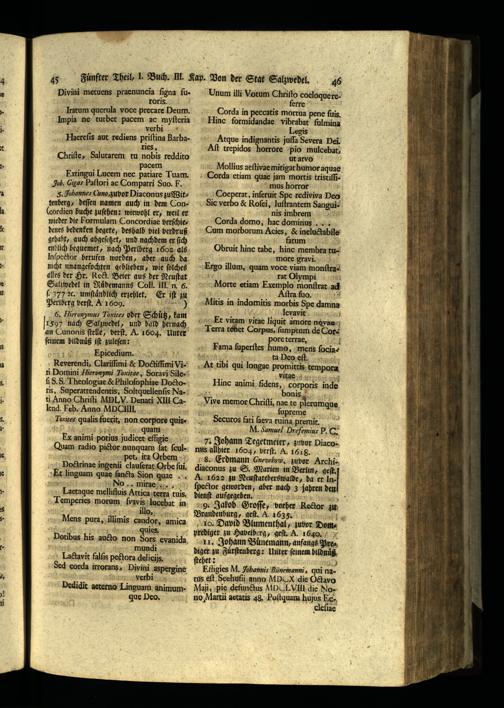 tum 2 Obruit hinc tabe, hinc memhra tu8 more gravi. Ergo illum, quam voce viam monſtra. rat Olympi; Morte etiam Exemplo inonſtrat ad , Aſtra ſuo. 1 Mitis in indomitis morbis Spe damna leranit 1 Et vitam vitae liquit amore nora Terra tehet Corpus, ſumptum de Sor. pore terrae, 8. Fama ſuperſtes humo, mens ſocia. ta De eſt At tibi qui longae promittis tempora vitag q n, Hinc animi fidens, corporis inde . ᷣ onis: Nie memor Chriſti, nae te plerumque al fupreme Securos fati faeva ruina premit. en,. M. Samuel Drefemius P. GC. 7. Johann Tegetmeier, zuvor Diaconus allhier 1604, verſt. A. 1618. ö 8. Erdmann Cnevebow, zuvor Archidiaconus zu S. Marien in Berlin, geſt. A. 1622 zu Neuſtateberswalde, da er Inſpector geworden, aber nach 3 jahren den dienſt aufgegeben. d Re 9. Jakob Groſſe, vorher Rector zu Brandenburg, geſt. A 1635.. 10. David Blumenthal, zuvor Domprediger zu Havelberg, geſt. A. 1640. 11. Johann Buͤnemann, anfangs Prediger zu Ʒuͤrſtenberg: Unter feinem bildnuͤß ſtehet: ö u Efhgies M. Johannis Bumemanni, qui natus eſt Seehuſii anno MDG X die Gctavo Maji, pie defunctus MDL MIIl die Nono. Marti aetatis 48, Poſtquam hujus. Eę7 cleſiae