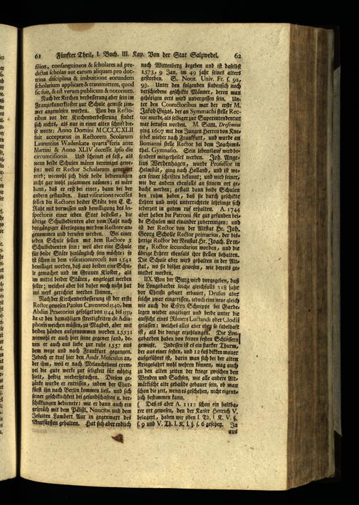 93. Unter den folgenden ſindenſich noch berſchiedene geſchikte Maͤnner, deren man gehörigen orts wird unvergeſſen fein, Uns ter den Conrectoribus war der erſte M. Jakob Gigas, der an Symmachi ſtelle kector wurde, als ſelbiger zur Superintendentur war berufen worden. NM. Sam. Drefemius ging 1607 mit den Jungen Herren von Kneſebek wieder nach Frankfurt, und wurde an Bumanni ſtelle Re&or hei dem Joachimsthal. Gymnaſio. Sein lebenslauf wird bes ſonders mitgetheilet werden. Joh. Angelius Werdenhagen, wurde Brofeſſor in Helmſtaͤt, ging nach Holland, und iſt wegen ſeiner ſchriften hekannt; und wird ſeiner, wie der andern ebenfalls an ſeinem ort gedacht werden; geſtalt dann beide Schulen den ruhm haben, daß ſie durch geſchikte Lehrer und wohl unterrichtete lehrlinge ſich iederzeit in gutem ruf erhalten. A. 1744 aher haben die Patroni fuͤr gut gefunden beide Schulen mit einander zubereinigen: und iſt der Rector won der Altſtat Hr. Joh. Georg Scholle Rector primarius, der bitzherige Kector der Neuſtat Hr. Joach. Le mme, Rector ſecundarius worden, und die übrige Lehrer ebenfals ihre ſtellen behalten. Die Schule aber wird gehalten in der Altſtat, wo fie bisher geweſen, wie bereits gez meldet worden.