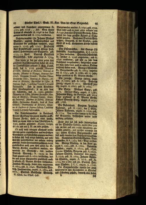 Die Oſſenbrüͤkten. Als George Op ſenbruͤtke, NRabtszberwandter, ſo A. 1576, 30 Jun. verſtorben. Dietrich Oſſenbruͤlke, welcher A. 1599 eingetreten, und A. 1652 verſtuͤrben, und alſo 54 jahr dem Nahthauſe borgeſtanden, dergleichen exempel man weder hier noch in andern Staͤten leichtlich finden wird. George Oſſenbrukke, Burgermeiſter geb. A. 1603, angetreten A. 1643, geſt. A. 1680, alt 77 jahr, beſage grabſtein in S. Marien Kirche.