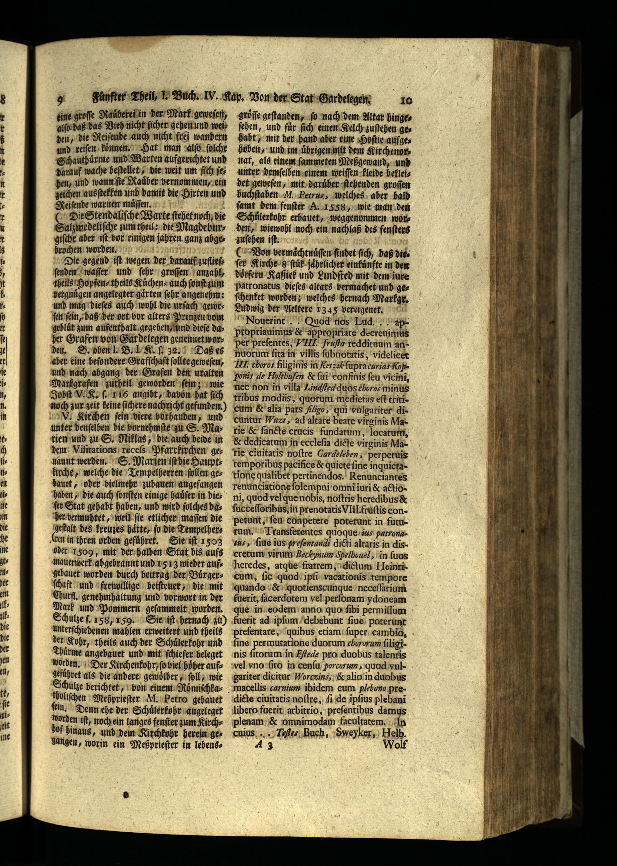 groͤſſe geſtanden, ſo nach dem Altar hingeſehen, und für ſich einen Kelch zuſtehen gehabt, mit der hand aber eine Hoſtie aufgehoben, und im üͤbrigen mit dem Kirchenornat, als einem ſammeten Meßgewand, und unter demſelben einem weiſſen kleide bekleidet geweſen, mit daruͤber ſtehenden groſſen buchſtaben M. Perus, welches aber hald ſamt dem fenſter A. 1558, wie man den Schülerfohr erbauet, weggenommen worden, wiewohl noch ein nachlaß des fenſters zuſehen iſt. (Von vermaͤchtnuͤſſen findet ſich, daß die ſer Kirche g ſtür jaͤhrlicher einkuͤnfte in den doͤtfern Kaßiek und Lindſted mit dem iure patronatus dieſes altars vermachet und ges ſchenket worden; welches hernach Markgr. Ludwig der Aeltere 1345 vereigenet. Nouerint. Quod nos Lud. U propriauimus’& approßtiare deereuimis Per preſentes, VII. fruſſa reddituum annuüorum ſita in villis ſubnotatis, videlicet NI choros ſiliginis in Kerzik ſupra curiat Kofle ponie de Holthufen& ſui eonfinis ſeu vicini, ner non in villa Hindhed duos chor minus tribus modiis, quorum medietas eſt triticum& alia pars fiigo, qui vulgariter dicuntur ſVuat, ad altare heate virginis Marie& ſaticte crucis fundatüm, locatum, & dedicatum in eccleſia dicte virginis Marie ciuitatis noſtre Gurdeleßen, perpetuis temporibus pacifice& quiete ſine jnquietatione qualibet pertinendos. Renunciantes renunciatione ſolempni omnĩ iuri& actioni, quod vel que nobis, noſtris heredibus&ᷣ ſucceſſoribus, in prenotatis Vlll. fruſtis conpetunt, ſeu conpetere poterunt in futurum. Transferentes quoque ius patronazus, ſiue ius proſentandi dicti altaris in discretum virum Becynum Ghelbouel, in ſuos heredes, atque fratrem, dictum Heinricum,(ic quod ipſi vacationis tempore quando& quotienscunque neceſſarium fuerit, ſacerdotem vel perſonam ydoneam que in eodem anno quo ſibi permiſſum fuerit ad ipſum debebunt ſiue poterunt preſentare, quihus etiam ſuper cambio, ſine permutatione duorum chororum ſiliginis ſitorum in Hlede pro duobus talentis vel vno ſito in cenſu porcarum, quod vulgariter dicitur IVorcxins,& alio in duobus