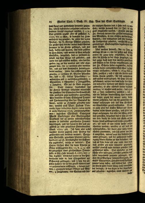 und ſtuͤhlen in der Kirche eingeſchlagen, und hat Hr. Schulze hiebei angemerket, daß di urſache dieſes entſezlichen falles ſchon 9 fahr vorher entſtanden, indem A. 1639, den 19 Febr. zwiſchen 5 und 6 uhr ein ſtarker wind dieſen thurm gefaſſet, fuͤr ſich aufgehoben und wieder niedergeſetzet, die ſpitze aber ſehr gekruͤmmet, mithin von dem dache drei ſparren neben drei hrettern und ſchiefer herunter geworfen, ſo aber alſobald wieder ergaͤnzet worden, er erzehlet auch weiter, daß 1565 den 4 Jun. nachmittag zwiſchen 2 und 3 uhr ein heftiger donnerſchlag ohne bermerktes blitzen gegen der mauer unter dieſen thurm geſchehen, daß um die galmloͤcher ein dampf aufgezogen und auf dem Kirchhofe ein ſchwefelicher geruch entſtanden. E waͤre auch eben der Kuͤſter Albert mit ſeinem knaben aufin thurm geweſen, und hätte den ſeiger aufgezogen, den aber der ſchlag gleichfals getroffen, dergeſtalt daß er ihm zur rechten ſeite durch die hoſen und ſchuhe an den beinen hinab geſchlagen und ſolche aufgeſchlit jet, als waͤre es mit einem meſſer aufgeſchnitten worden, woruͤher er als halb tod niedergefallen, der knabe aber haͤtte keinen ſchaden genommen, und ſich unten um hilfe umgethan, worauf man den bleßirten herunter getragen, und bei geſchehener beſichtigung keinen ſchaden an ihm befunden, nur daß an dem beine als eine rohte linie na dem groſſen zeh wäre hinunter gegangen, welcher ziemlich waͤre verletzt geweſen, und geſchmerzet haͤtte. Das oberleder an dem ſchuhe aber ware ganz zerriſſen geweſen, und hätte lappenweiſe herunter gehangen, wel chen ſchuh Markgraf Johann Georgens, damahls Churprinzen, gemahlin nach Lezlingen hinaus holen laſſen, und beſehen hat. Oben im thurm hätte dieſer ſchlag auch einen ſtander verletzet, ſo den ſeiger in der ſeigerkam mer gehalten: ingleichen einen 2
