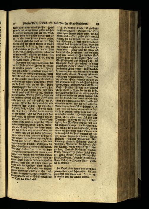 egen fuͤden heraus geriſſen. Inder: — wetter immer groͤſſer und ſtaͤrler worden, und hätte man um beide Kirchthuͤrme ſehen feuer fliegen und zur erde fallen, ſo aber keinen fernern ſchaden gethan. Ein weit gluͤklicher nicht nur der ſpitze, ſondern auch des ganzen thurms iſt geweſen der thurmfall, fo A. 1643, den 1 Aug. am groſſen behttage zu Frankfurt an der Oder bei S. Niklas Kirche geſchehen, indem dabei kein menſch zuſchaden gekommen. S. Beſchr. der Stat Frankf. ſ. C5, und bei S. Petri Kirche zu Berün. 7 ( Inzywiſchen ſein zu wiederaufbauung beides der Kirche und des Thurms alle moͤgliche anſtalten gemachet, und A. 1659, 3 Mai zur Kirche der grundſtein geleget worden, dabei der erſte Burgermeiſter, Jakob Albrecht nach einer kurzen rede und wunſch an dem gelegten grundſtein 3 kellen kalk geworfen mit den worten: Die guͤte des Herrn iſt, daß wir nicht gar aus fein: Seine Barmherzigkeit hat noch fein ende, ſondern ſie iſt alle morgen neu, und ſeine treu iſt groß, aus Thren 3, 22. Welchem Burgermeiſter Martin Falko gefolget mit den worten: Deine gute ſei, Herr, über uns, wie wir auf dich hoffen, aus Pi. 33. 22. Ferner der Kirchenborſteher und Kaͤmmerer Joh. Schulz, der geſprochen: O Herr, hilf, o Herr, laß wohl gelingen. Pl. 118, 25. Endlich der Secrerarius mit den worten: Wo der Herr nicht das haus bauet, ſo arbeiten umſonſt die daran bauen: aus Pſ. 127, 1. Worauf denn alle anweſende nach dem beiſpiel des Kuͤſters und mauermeiſters gerufen: Amen, Amen! Die ſache iſt auch ſo gut bon ſtatten gegangen, daß der bau noch vor ablauf eines jahres unters dach und ins trokne gekömmen, und. 1600 nach Invocavit die erſte pres digt, und zwar eine woch enpredigt bon Joach. Neben, und. 1567. Dom. 1 Adv. vom Superintendent Laurenz Schulzen, die erſte Hohemeßpredigt darin gehalten worden. as aber Ovidius Pont. II. vn. vm. ſagt: lanquillas etiam naufragus horret aquas, as hat man damahls bei den Gemeinen beider Kirchen geſpüͤhret, da auch bei einem geringen getoͤſe ſolche in furcht und ſchrekren zetahten, auch wohl zur Kirche hinaus geufen und den Prediger allein gelaſſen. hhulze ſ. 207. Endlich hat man auch den Dur wieder mit Glolken berſehen, und ſein auſſer der Uhrglokke, die Groſſe glokke, die onntagsglotke und die Schelle vorhanden.) Theil der Mark. Hiſt.