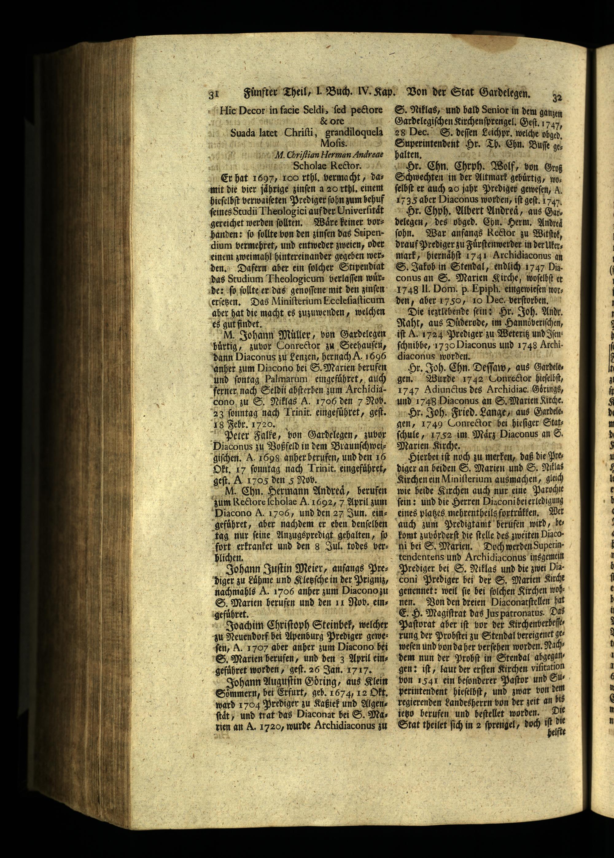 Hr. Joh. Chn. Deſſaw, aus Gardele= gen. Wurde 1742 Conrector hieſelbſt, 1747 Adiunctus des Archidiac. Görings, und 1748 Diaconus an S. Marien Kirche. Br. Joh. Fried. Lange, aus Gardelegen, 1749 Conrector bei hieſiger Statſchule, 1752 im Maͤrz Diaconus an S. Marien Kirche. CD