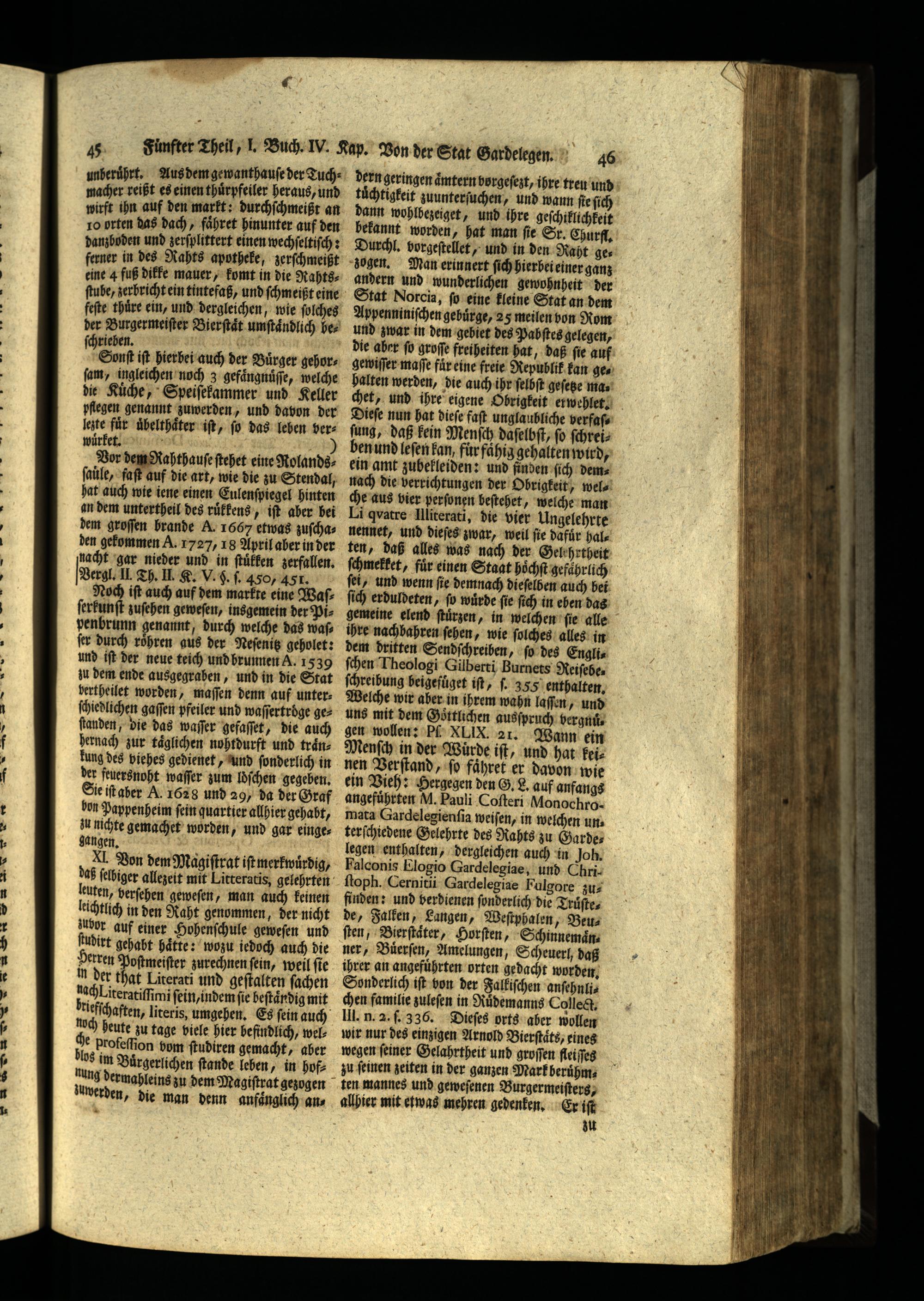 XI. Von dem Magiſtrat iſt merkwurdig, daß ſelbiger allezeit mit Litteratis, gelehrten euten, verſehen geweſen, man auch keinen lichtlich in den Naht genommen, der nicht zuvor auf einer Hohenſchule geweſen und ſudirt gehabt hatte;: wozu iedoch auch die herren Poſtmeiſter zurechnen fein, weil ſie in der that Literati und geſtalten ſachen nach iteratiſſimi ſein, indem fie beſtaͤndig mit riefſchaften, literis, umgehen. Es ſein auch noch heute zu tage viele hier befindlich, wel