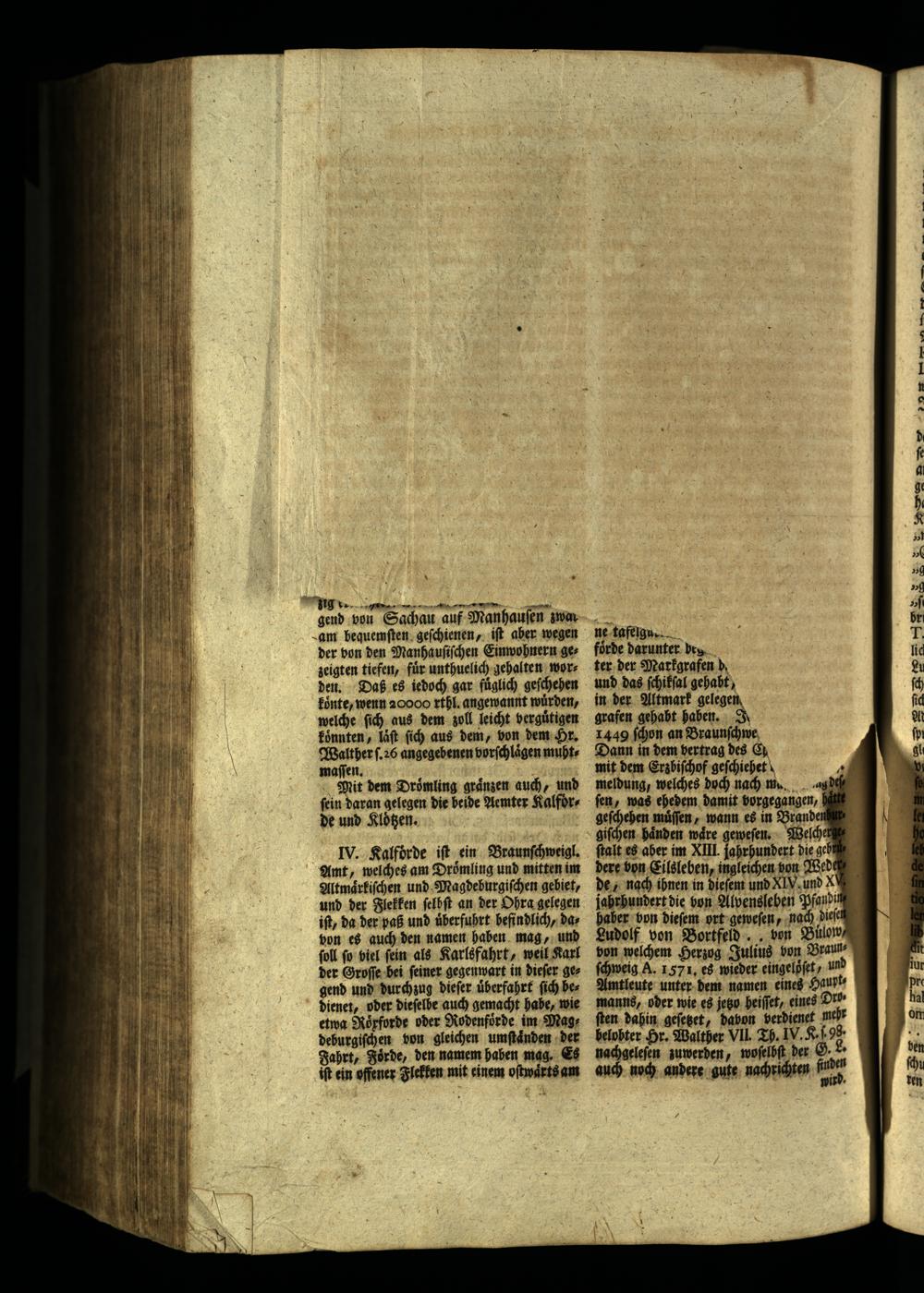 der von den Manhauſiſchen Einwohnern gezeigten tiefen, für unthuelich gehalten worden. Daß es iedoch gar fuͤglich geſchehen koͤnte, wenn 20000 rthl. angewannt wurden, welche ſich aus dem zoll leicht verguͤtigen koͤnnten, laͤſt ſich aus dem, von dem Hr. Walther ſ. 26 angegebenen vorſchlaͤgen muhtmaſſen. Mit dem Droͤmling graͤnzen auch, und fein daran gelegen die heide Aemter Kalfoͤrde und Kloͤtzen.|