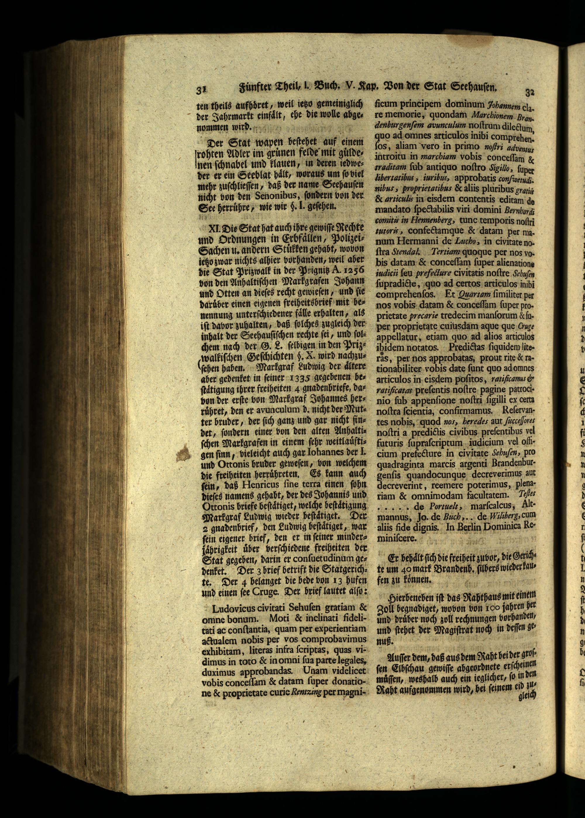 inhalt der Seehauſiſchen rechte ſei, und ſolchem nach der G. L. ſelbigen in den Prizwalkiſchen Geſchichten 5. X. wird nachzu(ſehen haben. Markgraf Ludwig der aͤltere aber gedenket in feiner 1335 gegebenen beſtaͤtigung ihrer freiheiten 4 gnadenbriefe, dar