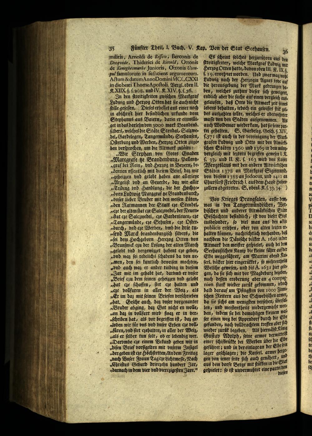 R. XIIX. 5. ſ. 208. und IV. K. XIV. S. ſ. 56. In den ſtreitigkeiten zwiſchen Markgraf Ludwig und Herzog Otten hat ſie auch nicht ſtille geſeſen. Dieſes erhellet aus einer noch in abſchrift hier befindlichen urkunde vom Stephanus aus Baiern, darin er einwilliget in das darlehn von 3000 mark Brandenb. ſilbers, welches die Staͤte Stendal, Salzwedel, Gardelegen, Tangermünde, Seehauſen, Oſterburg und Werben, Herzog Otten zuge