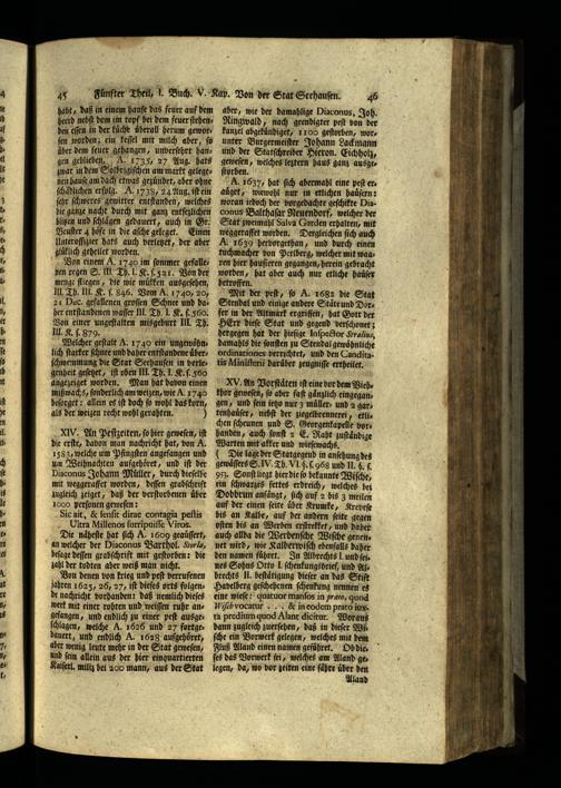 XIV. An Peſtzeiten, ſo hier geweſen, iſt die erſte, dabon man nachricht hat, von A. 1583, welche um Pfingſten angefangen und um Weihnachten aufgehoͤret, und iſt der Diaconus Johann Muller, durch dieſelbe mit weggeraffet worden, deſſen grabſchrift zugleich zeiget, daß der verſtorbenen uͤber 1000 perſonen geweſen: