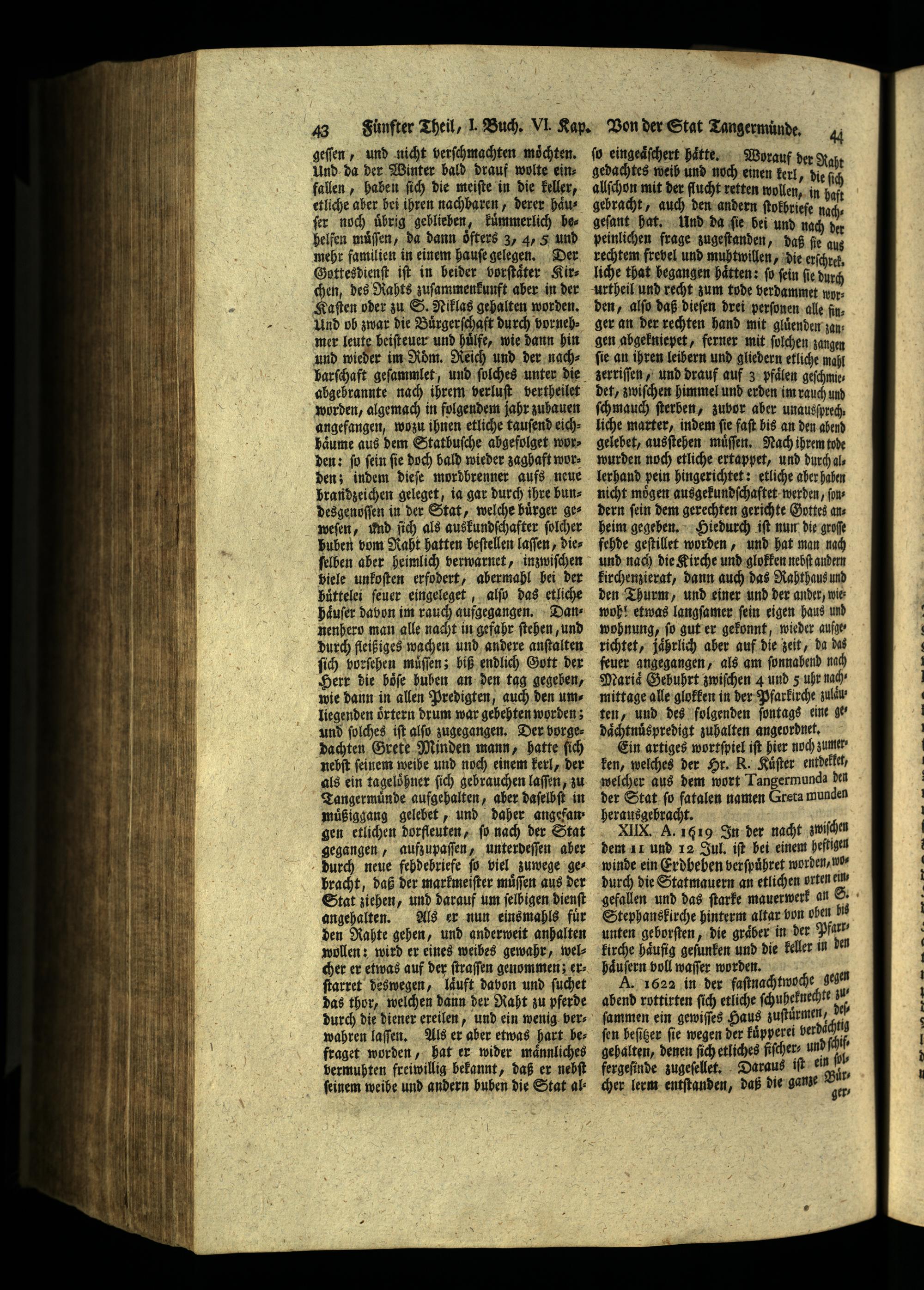 XIX. A. 1619 In der nacht zwiſchen dem 11 und 12 Jul. iſt bei einem heftigen winde ein Erdbeben verſpuͤhret worden, wodurch die Statmauern an etlichen orten ein gefallen und das ſtarke mauerwerk an Stephanskirche hinterm altar von ohen bis unten geborſten, die graͤber in der Pfart, kirche haͤufig geſunken und die keller in den haͤuſern voll waſſer worden.