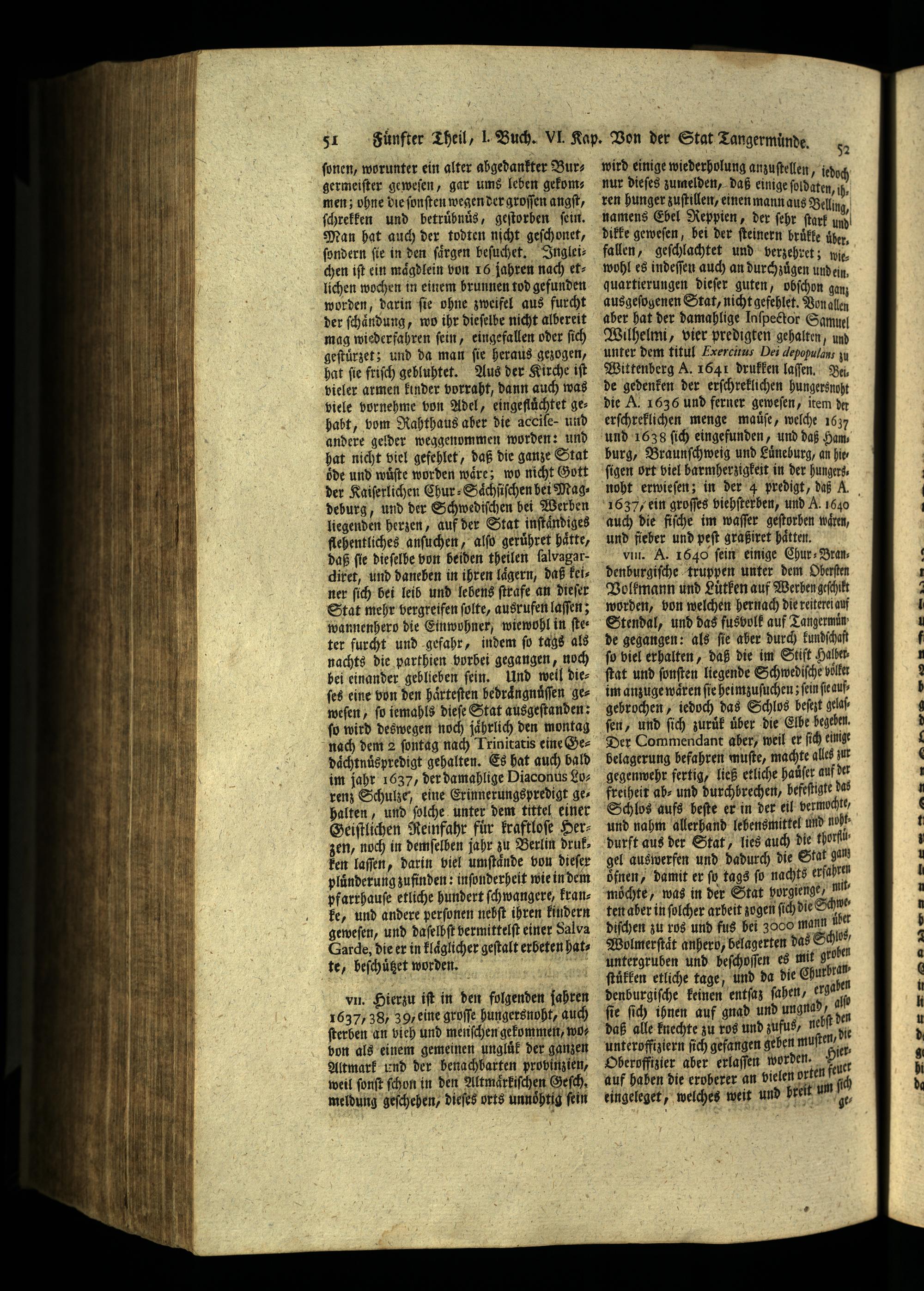 weſen, fo iemahls dieſe Stat ausgeſtanden: ſo wird deswegen noch jaͤhrlich den montag nach dem 2 ſontag nach Trinitatis eine Gedaͤchtnuͤspredigt gehalten. Es hat auch bald im jahr 1637, der damahlige Diaconus Lorenz Schulze, eine Erinnerungspredigt gehalten, und ſolche unter dem tittel einer Göeiſtlichen Reinfahr für kraftloſe Herzen, noch in demſelben jahr zu Berlin drukken laſſen, darin biel umſtaͤnde von dieſer pluͤnderung zufinden: inſonderheit wie in dem pfarrhauſe etliche hundert ſchwangere, kranke, und andere perſonen nebſt ihren kindern geweſen, und daſelbſt bermittelſt einer Salva Garde, die er in klaͤglicher geſtalt erbeten hatte, beſchuͤtzet worden...