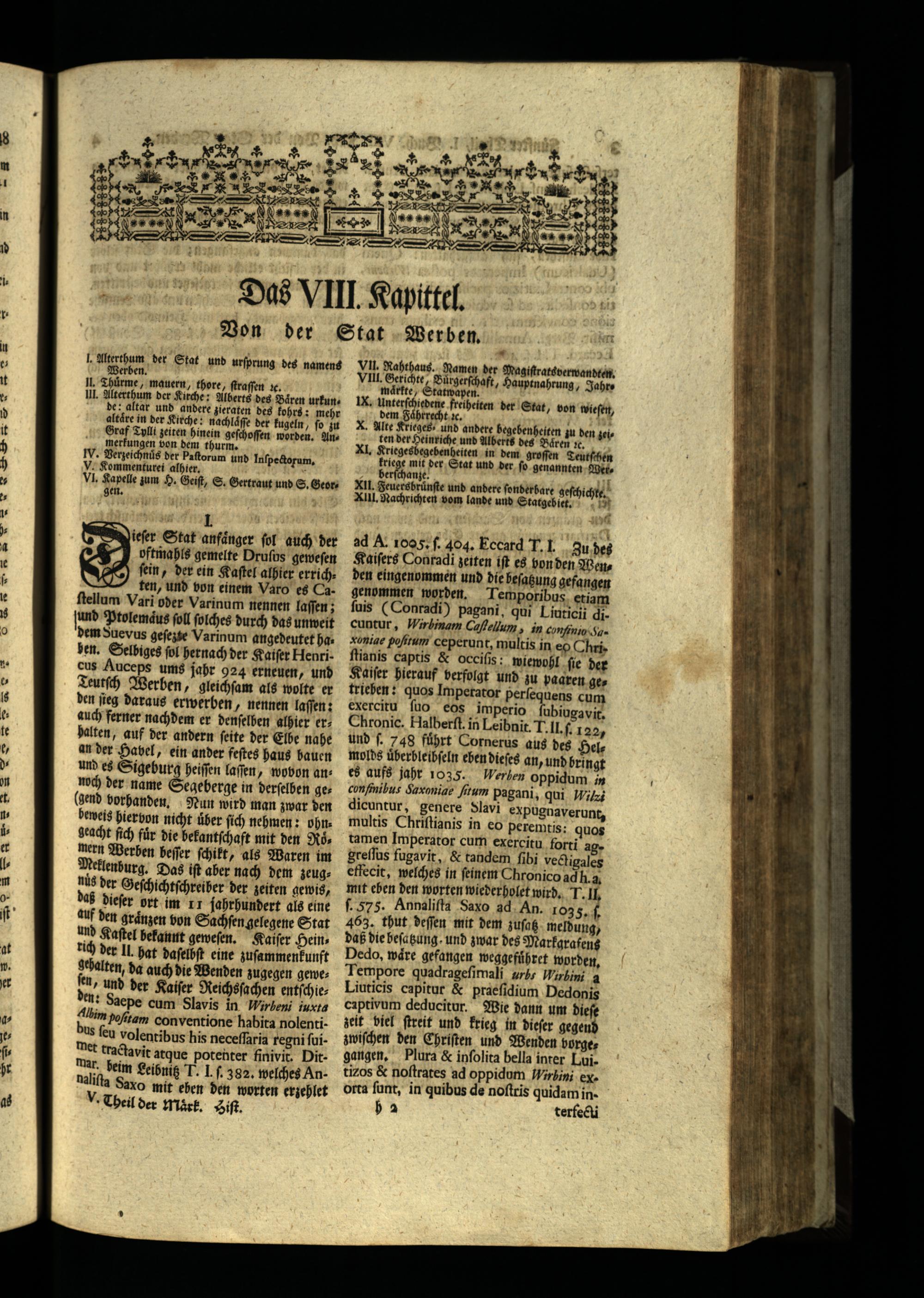 dem Sue vus geſezte Varinum angedeutet haben. Selbiges ſol hernach der Kaiſer Henricus Auceps ums jahr 924 erneuen, und Teutſch Werben, gleichſam als woſte er den ſieg daraus erwerben, nennen laſſen: auch ferner nachdem er denſelben alhier erhalten, auf der andern ſeite der Elbe nahe an der Havel, ein ander feſtes haus bauen und es Sigeburg heiſſen laſſen, wobon annoch der name Segeberge in derſelben ge(gend vorhanden. Nun wird man zwar den beweis hiervon nicht über ſich nehmen: ohn. geacht ſich für die bekantſchaft mit den Roͤmern Werben beſſer ſchikt, als Waren im Meklenburg. Das iſt aber nach dem zeugnus der Geſchichtſchreiber der zeiten gewis, das dieſer ort im nr jahrhundert als eine auf den graͤnzen bon Sachſen gelegene Stat und Kaſtel bekannt geweſen. Kaiſer Heinrich der Il. hat daſelbſt eine zuſammenkunft gehalten, da auch die Wenden zugegen geweſen, und der Kaiſer Reichsſachen entſchieen: Saepe cum Slavis in Wirbeni iuxta Albim pofitam conventione habita nolentius ſeu volentibus his neceſſaria regni ſuiMet tractavit atque potenter finivit. Ditmar. beim Leibnitz J. I.ſ. 382. welches Annaliſta Saxo mit eben den worten erzehlet M Cheil der Mark. Zif.