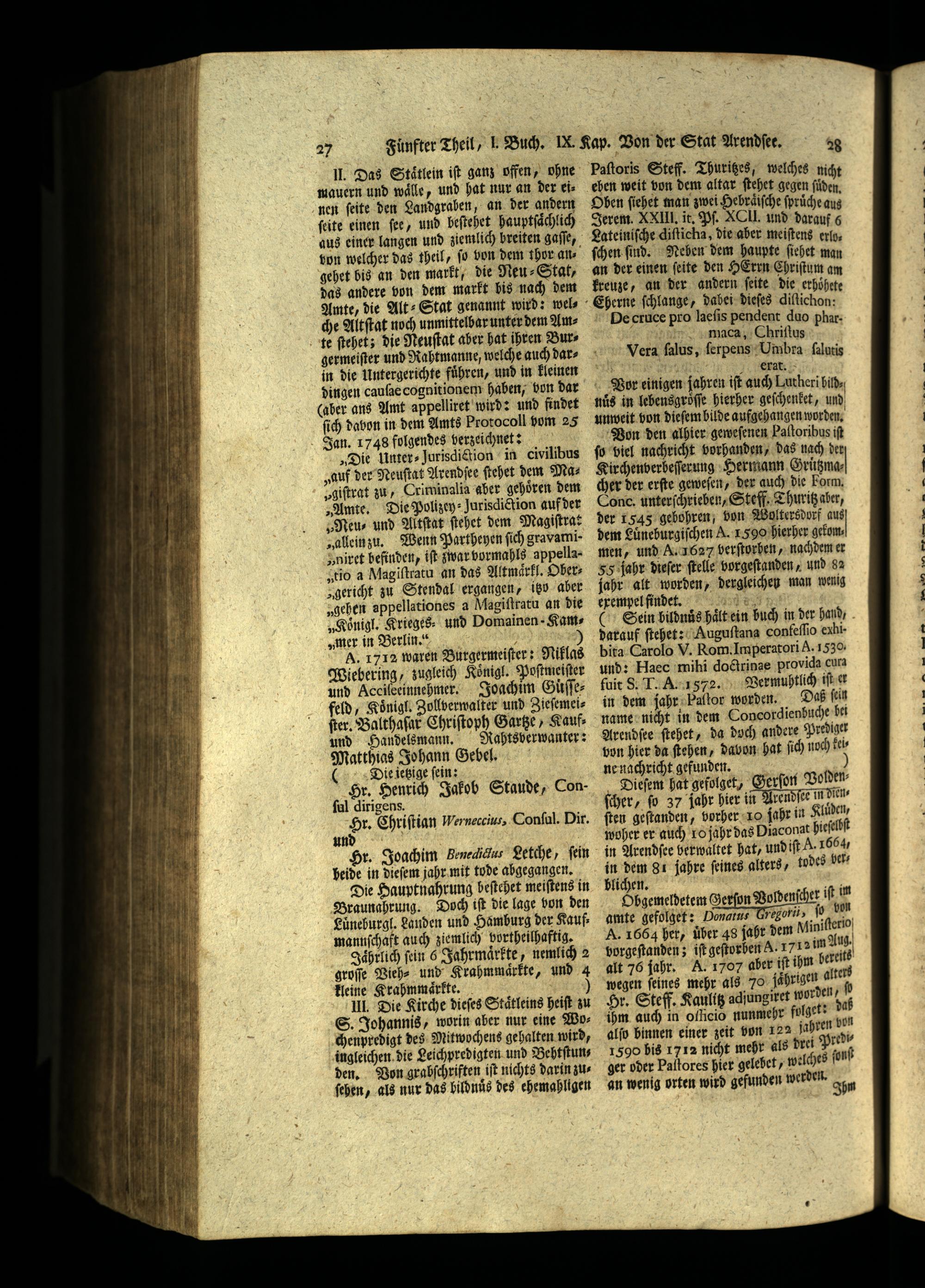 De cruce pro laeſis pendent duo pharmiaca, Chriſtus Vera ſalus, ſerpens Umbra ſalutis .. cexar. Vor einigen jahren iſt auch Lutheri bilde, nuͤs in lebensgroͤſſe hierher geſchenket, und unweit von dieſem bilde aufgehangen worden. Von den alhier geweſenen Paſtoribus if fo viel nachricht vorhanden, das nach der Kirchenverbeſſerung Hermann ö cher der erſte geweſen, der auch die Form. Eonc. unterſchrieben, Steff. Thuritz aber, der 1545 gebohren, bon Woltersdorf aus dem Luͤneburgiſchen A. 1590 hierher gefonts men, und A. 16a berſtorhen, nachdem er 55 jahr dieſer ſtelle borgeſtanden, und 82 jahr alt worden, dergleichen man wenig exempel findet.. Sein bildnuͤs haͤlt ein buch in der hand, darauf ſtehet: Auguſtana confeſſio exhi · bita Carolo V. Rom. Imperatori A. 1530. und: Haec mihi doctrinae provida cuta fuit 8 J. A. 1572. Vermuhtlich iſt e in dem jahr Baſtor worden. Daß ſen name nicht in dem Concordienbuche hei Arendſee ſtehet, da doch andere Prediger von hier da ſtehen, Davon: hat ſich noch km ne nachricht gefunden. Dieſem hat gefolget, Gerſon Voldenſcher, ſo 37 jahr hier in Arendſer in Jlenſten geſtanden, vorher 10 jahr in Klüden woher er auch 10 jahr das Diaconat hieſellſt in Arendſee verwaltet hat, und iſt A. 1664, in dem 81 jahre feines alters, todes herblichen. 3 Obgemeldetem Gerſon Voldenſcher iſt im amte gefolget: Dondtus egorii, ſo bon A. 1664 het, über 48 jahr dem Minift vorgeſtanden; iſt geſtorben A. 17 alt 76 jahr. A. 1707 aber iſt ih wegen feines mehr als 76 jaͤh Hr. Steff. Kaulitz adjungiret w ihm auch ın officis nunmehr folget: 90 alſo binnen einer zeit bon 122 jahren ken 1590 bis 1712 nicht mehr als drei. ger oder Paſtores hier gelebet, welches ſon an wenig orten wird gefunden werden. pm