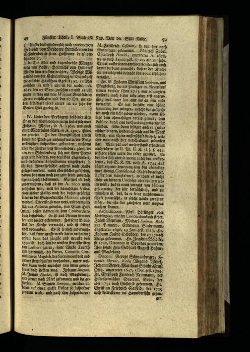 M. Friedrich Geſeniu, ſo bon hier nach Gardelegen! gekommen. Mdalrich Zobel. Chriſtoph Henrici, angetreten A. 1672, 24 O nach Trinit. geſt. 1727, alt 81 jahr. Er hat auſſer ſeinen amtsberdienſten ſich auch damit verdient gemacht, daß er der Kirche ein vermachtnüs beinahe von 2o0co rthl. hinterlaſſen. ig Sr. MI. Johann Chriſtian Goclenius aus Magdeburg, der als Prediger in Neuendorf feinem borfahr ſchon 1713 war adiungiret worden, nach deſſen tode aber erſt angezogen, weil iener ſein amt bis an ſein ende verwaltet. Es hat derſelbe eine fchöne ſammlung von muͤnzen, welche den geſchichten noch ein licht geben würden, wann ſelbige dem ehemahligen vorſatz gemds, dem Publico durch eine beſchreibung mitgetheilet wurden. Wie dann ſelbiger auch in Siſtoriſchen dingen, ſonderlich auch was die Mark betrift, eine schöne wiſſenſchaft beſitzet, welcher man auch hier verſchiedenes zudanken hat. Man hat aus misverſtand erhaltener nachrichten im Il. Th. Il. K. II. S.. 444. ſelbigen ſchon unter die todte gezehlet. Er befindet ſich aber ſo wenig unter den berſtor, benen, daß S. K. M. noch A. 1744 aus höchſt eigener bewegung ihm den Charakter eines Koͤnigl. Gonſiſtorial· Rahts beigeleget. Auſſer dem münzkabinet, welchem es nicht leicht an ſeltenen Oncialen oder thalern ſehlen wird, hat er einen vorraht von buͤchern geſammelt, der ſehr beträchtlich, und zu wuͤnſchen iſt, daß, da er keine nachkommen. ſchaft hinterlaͤßt, in ſolche haͤnde gerahten moͤge, die ihn der gelehrten welt nutzbar machen koͤnnen.— Atchidiaconi: Abel Hoͤtlinger oder Hechlingius, wie im Concordienbuch ſtehet. Jakob Benkam, Michael Dalaeu, Kagpar Pinnow, Erdmann Bindemann, angetreten 1696, 19 Jan. geſt. 1713. Hr. Johann Jakob Schröder, der 1735 nach Berge gekommen. Hr. Joachim Boͤldike, ſo 1742, Diaconus in Spandau geworden. Ihm folgte Herr Gebhard Auguſt Hahne, aus Magdeburg.; Diaconi: George Schwanberger, R hannes Marcus, Wedig Wigand Wibek, Johann Beyer, Matthias Schicht, Ernſt Otto, angetreten 1697, 5 Dec. geſt. 1724. Hr. Chriſtoph Friedrich Reinmann, des Hildesheimiſchen Superint. Sohn, der aber 1732 nach Guͤſſefeld gekommen. Hr. Chriſtian Friedrich Salfeld, der 1739 nach Nettelkamp ins Hanndͤveriſche gegangen.