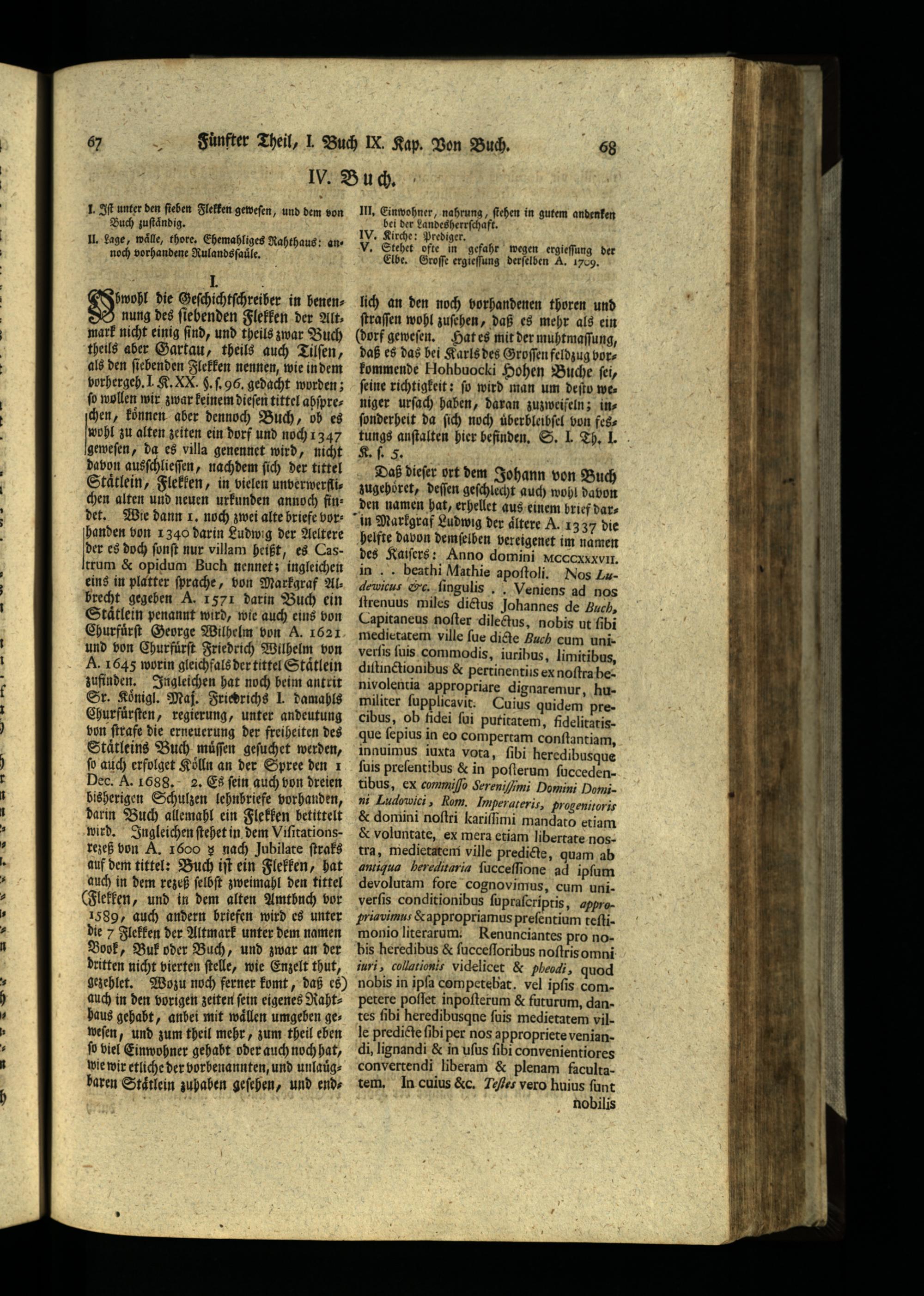 mark nicht einig ſind, und theils zwar Buch theils aber Gartau, theils auch Tilſen, als den ſiebenden Flekken nennen, wie in dem borhergeh. I K. XX. 5. ſ. 96. gedacht worden; fo wollen wir zwar keinem dieſen tittel abſprechen, koͤnnen aber dennoch Buch, ob es wohl zu alten zeiten ein dorf und noch 1347 geweſen, da es villa genennet wird, nicht davon ausſchlieſſen, nachdem ſich der tittel Staͤtlein, Flekken, in vielen unverwerflichen alten und neuen urkunden annoch fin: det. Wie dann 1. noch zwei alte briefe borhanden von 1340 darin Ludwig der Aeltere ber es doch ſonſt nur villam heißt, es Castrum& opidum Buch nennet; ingleichen eins in platter ſprache, von Markgraf Al: brecht gegeben A. 1571 darin Buch ein Staͤtlein penannt wird, wie auch eins von Churfuͤrſt George Wilhelm bon A. 1621 und von Churfüͤrſt Friedrich Wilhelm von A. 1645 worin gleichfals der tittel Staͤtlein zufinden. Ingleichen hat noch beim antrit Sr. Koöͤnigl. Maf. Friedrichs 1. damahls Churfuͤrſten, regierung, unter andeutung von ſtrafe die erneuerung der freiheiten des Staͤtleins Buch muͤſſen geſuchet werden, ſo auch erfolget Koͤlln an der Spree den 1 Dec. A. 1688. 2. Es ſein auch von dreien bisherigen Schulzen lehnbriefe vorhanden, darin Buch allemahl ein Flekken betittelt wird. Ingleichen ſtehet in dem Viſitationsrezeß on A. 1600 8 nach Jubilate ſtraks auf dem tittel: Buch iſt ein Flekken, hat auch in dem rezeß ſelbſt zweimaͤhl den tittel (Flekken, und in dem alten Amtbuch vor 1589, auch andern briefen wird es unter die 7 Ilekken der Altmark unter dem namen Book, Buk oder Buch, und zwar an der dritten nicht vierten ſtelle, wie Enzelt thut, gezehlet. Wozu noch ferner komt, daß es) auch in den vorigen zeiten ſein eigenes Rahthaus gehabt, anbei mit waͤllen umgeben geweſen, und zum theil mehr, zum theil eben ſo viel Einwohner gehabt oder auch noch hat, wie wir etliche der vorbenannten, und unlaůgbaren Staͤtlein zuhaben geſehen, und end