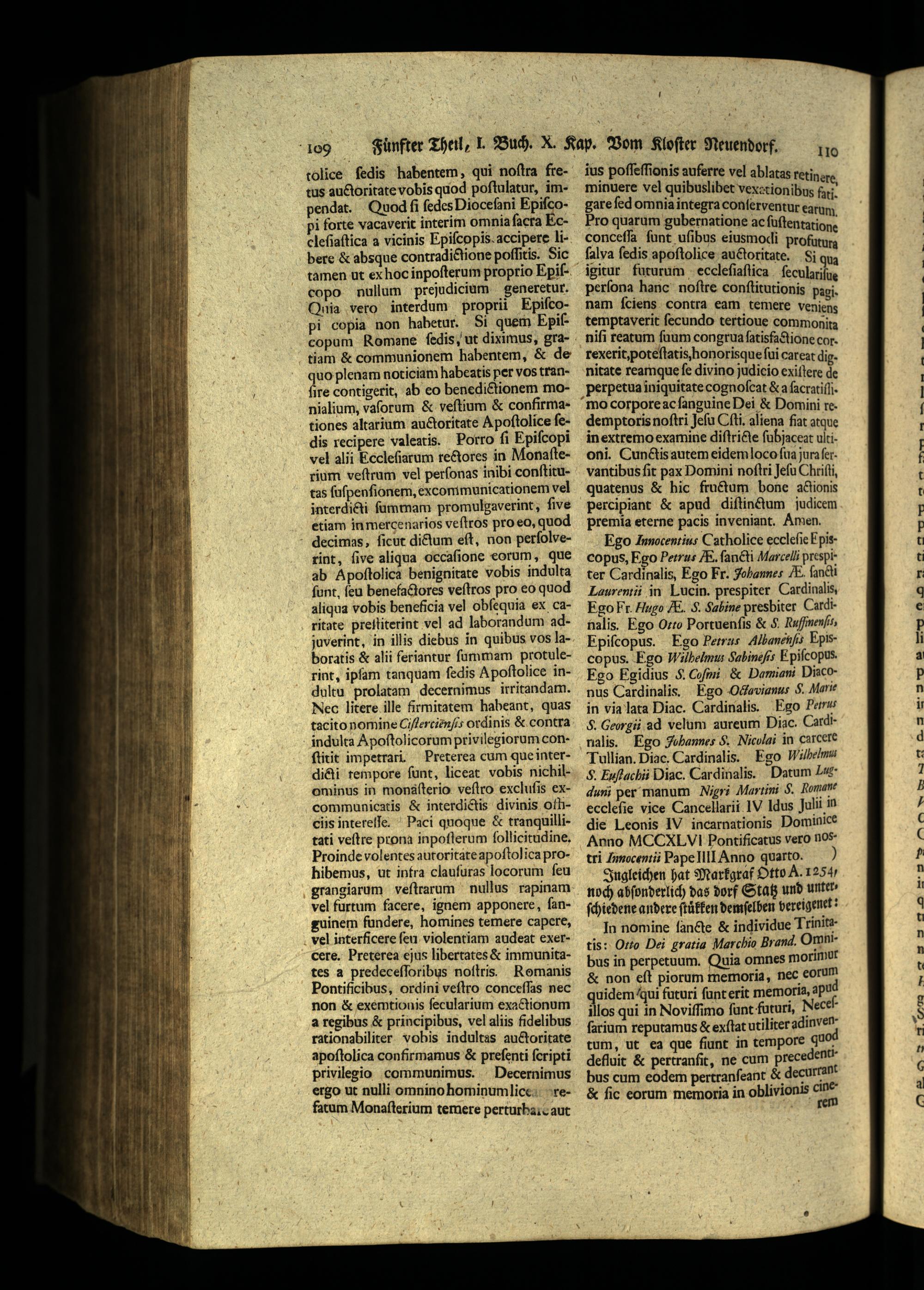 demptoris noſtri Jeſu Cſti. aliena fiat atque in extremo examine diſtricte ſubjaceat uſtioni. Cunctis autem eidem loco{ua jura fervantibus fit pax Domini noſtri Jeſu Chriſti, quatenus& hic fructum bone acſionis percipiant& apud diſtinctum judicem premia eterne pacis inveniant. Amen. Ego Iunocentius Catholice eccleſie Episcopus, Ego Petrus. ſancti Marcelli prespiter Cardinalis, Ego Fr. Johannes. ſancti Laurentii in Lucin. prespiter Cardinalis, Ego Fr Hugo Æ.& Sabine presbiter Cardinalis. Ego Outo Portuenſis&& Ruffinenfss Epiſcopus. Ego Petrus Albancnſis Episcopus. Ego Wilhelmus Sabinefis Epiſcopus Ego Egidius& Cuſuni& Damian Diaco. nuͤs Cardinalis. Ego Octuvianus S. Marie in via lata Diac. Cardinalis. Ego Petrus & Georgi ad velum aureum Diac. Cardinalis. Ego Johannes& Nicolai in carcere Tullian. Biac. Cardinalis. Ego Ihilhe mu S Eußachii Diac. Cardinalis. Datum Luduni per manum Migri Martini S. Roman“ eccleſie vice Canceſſarii V Idus Juli in die Leonis IV incarnationis Dominice Anno MCCXLVI Pontificatus vero nos. tri Innocenti Pape llll Anno quarto. Ingleichen hat Markgraf Otto A. 12584, noch abſonderlich das dorf Statz und unter ſchiedene andere ſtuͤkken demſelben vereigenet: In nomine ſancte& individue Lrinitatis: Ouo Dei gratid Marchio Brand. Omni bus in perpetuum. Quia omnes morimur & non eſt piorum memoria, nec CONM quidem qui futuri ſunt erit memoria,. abu illos qui in Noviſſimo ſunt faturi, Neceſarium reputamus& enſtat utiliter adin ten tum, ut ea que ſiunt in tempore quo; defluit& pertranſit, ne cum precedenti bus cum eodem pertranſeant& decurran“ & ſic eorum memoria in oblivionis*