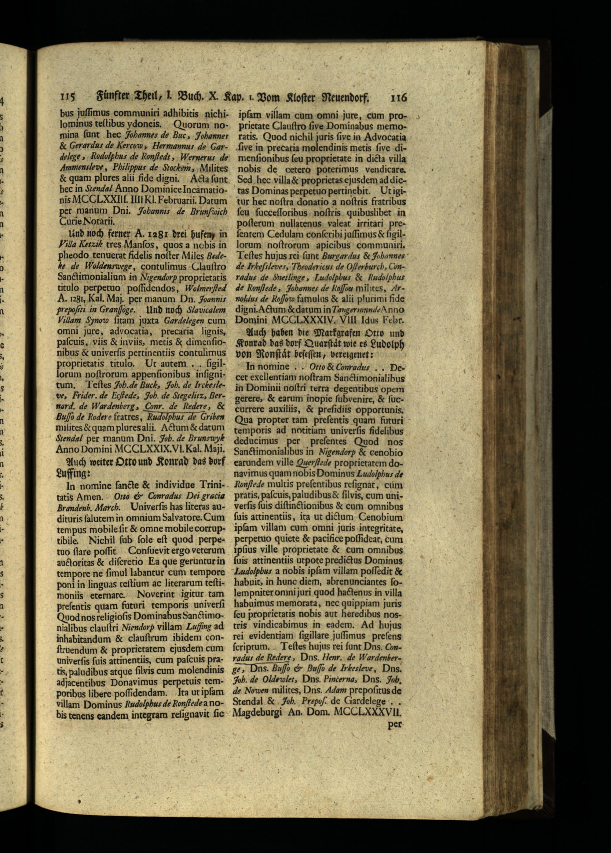 ipſam villam cum omni jure, cum proprietate Clauſtro ſive Dominabus memoratis. Quod nichil juris ſive in Advocatia ſive in precaria molendinis metis ſive dimenſionihus ſeu proprietate in dicta villa nobis de cetero poterimus vendicare. Sed hec villa& proprietas ejusdem ad dictas Dominas perpetuo pertinebit. Ut igitur hec noſtra donatio a noſtris fratribus ſeu ſucceſſorihus noſtris quibuslibet in poſterum nullatenus valeat irritari preſentem Cedulam conſcribi juſſimus& ſigillorum noſtrorum apicihus communiri. Teſtes hujus rei ſunt Burgardus& Johannes de Irbeſileve, Theodericus de COſlerburch, Conradu de Ghetlinge, Ludolphus& Rudolphus de Ronſtede, Johannes de Rofou milites, Arnoldus de Rofow famulus& alii plurimi fide digni. Actum& datum in Tangermunde Anno Domini MCCLXXXIV. Vlll Idus Febr.