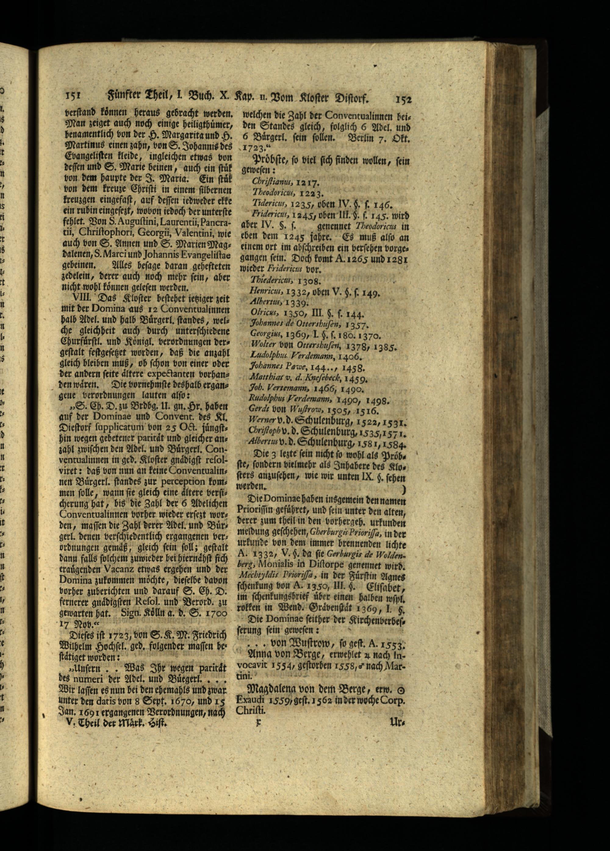 VIII. Das Kloſter beſtehet jetziger zeit mit der Domina aus 12 Conventualinnen halb Adel. und halb Buͤrgerl. ſtandes, welche gleichheit auch durch unterſchiedene Churfuͤrſtl. und Koͤnigl. verordnungen Ders geſtalt feſtgeſetzet worden, daß die anzahl gleich bleiben muß, ob ſchon von einer oder der andern ſeite aͤltere expectanten vorhanden waͤren. Die vornehmſte deshalb ergangene verordnungen lauten alſo: