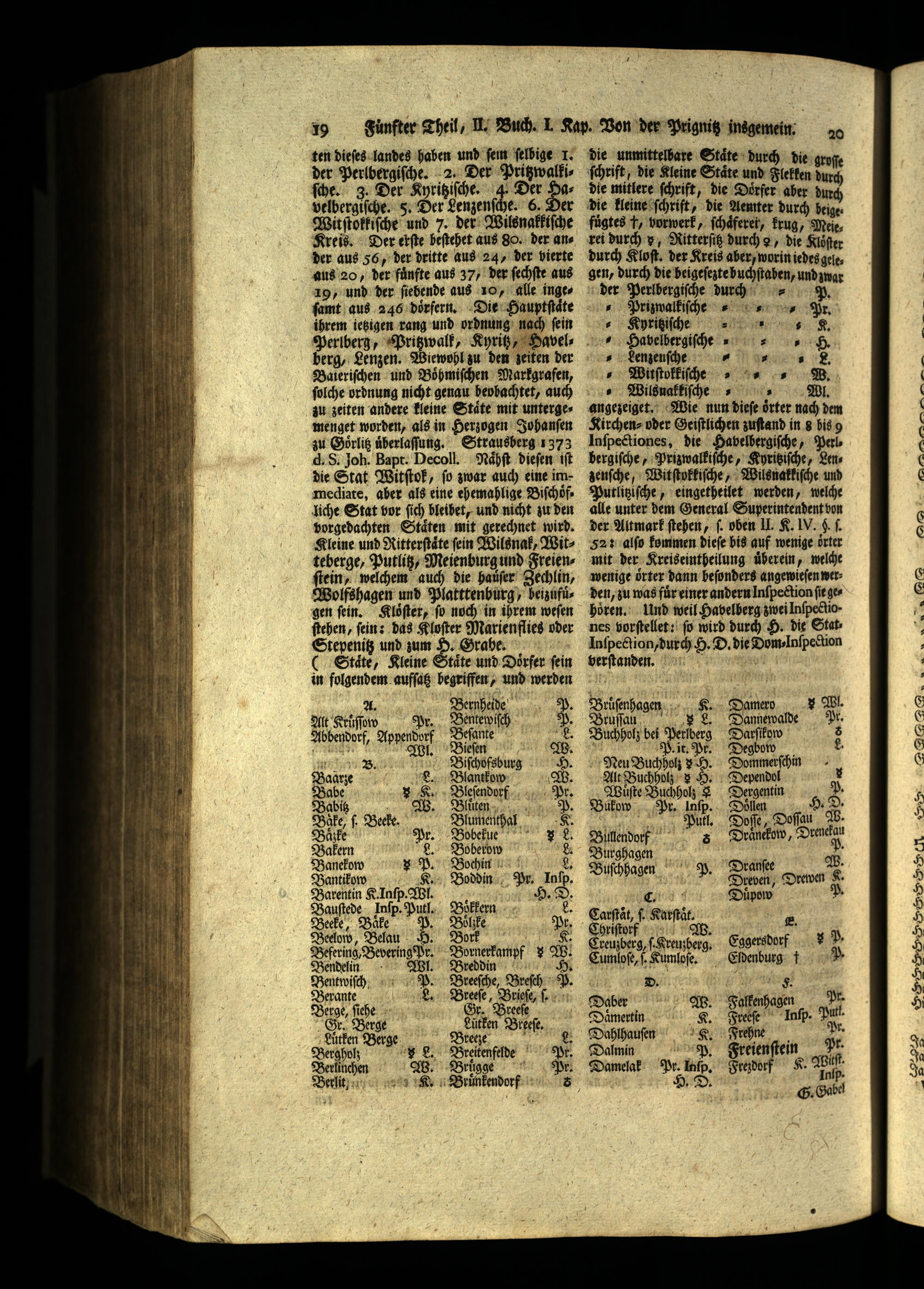 52: alſo kommen dieſe bis auf wenige oͤrter mit der Kreiseintheilung uͤberein, welche wenige oͤrter dann beſonders angewieſen werden, zu was für einer andern lnſpection fie ges hören. Und weil Havelberg zwei Inſpellio. nes vorſtellet: fo wird durch H. die Stat Inſpection, durch H. D. die Dom Inſpeckon