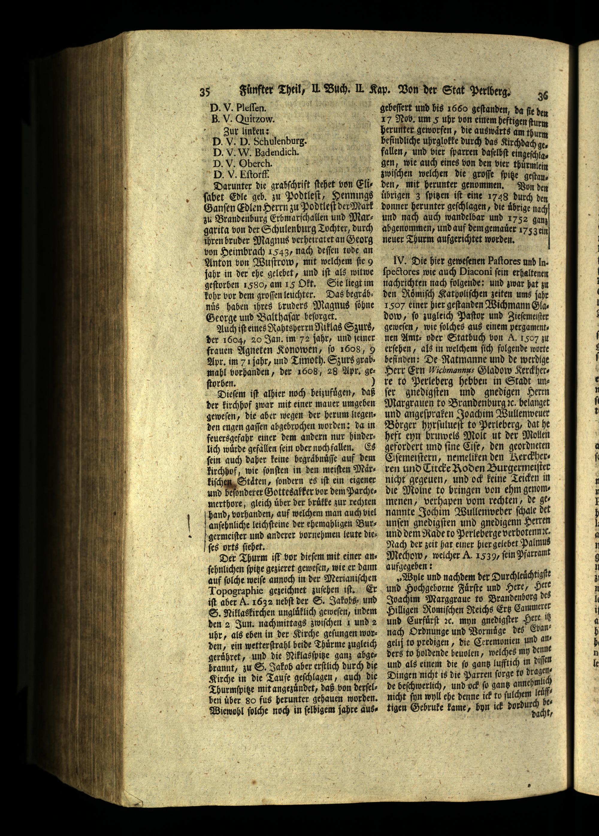 IV. Die hier geweſenen Paſtores und In. ſpectores wie auch Diaconi ſein erhaltenen nachrichten nach folgende: und zwar hat zu den Roͤmiſch Katholiſchen zeiten ums jahr 1507 einer hier geſtanden Wichmann Gladow, fo zugleich Paſtor und Zieſemeiſter geweſen, wie ſolches aus einem pergamentnen Amt⸗ oder Stathuch bon A. 1507 zu erſehen, als in welchem ſich folgende worte befinden: De Ratmanne und de werdige Herr Ern Wichmannus Gladow Kerckher