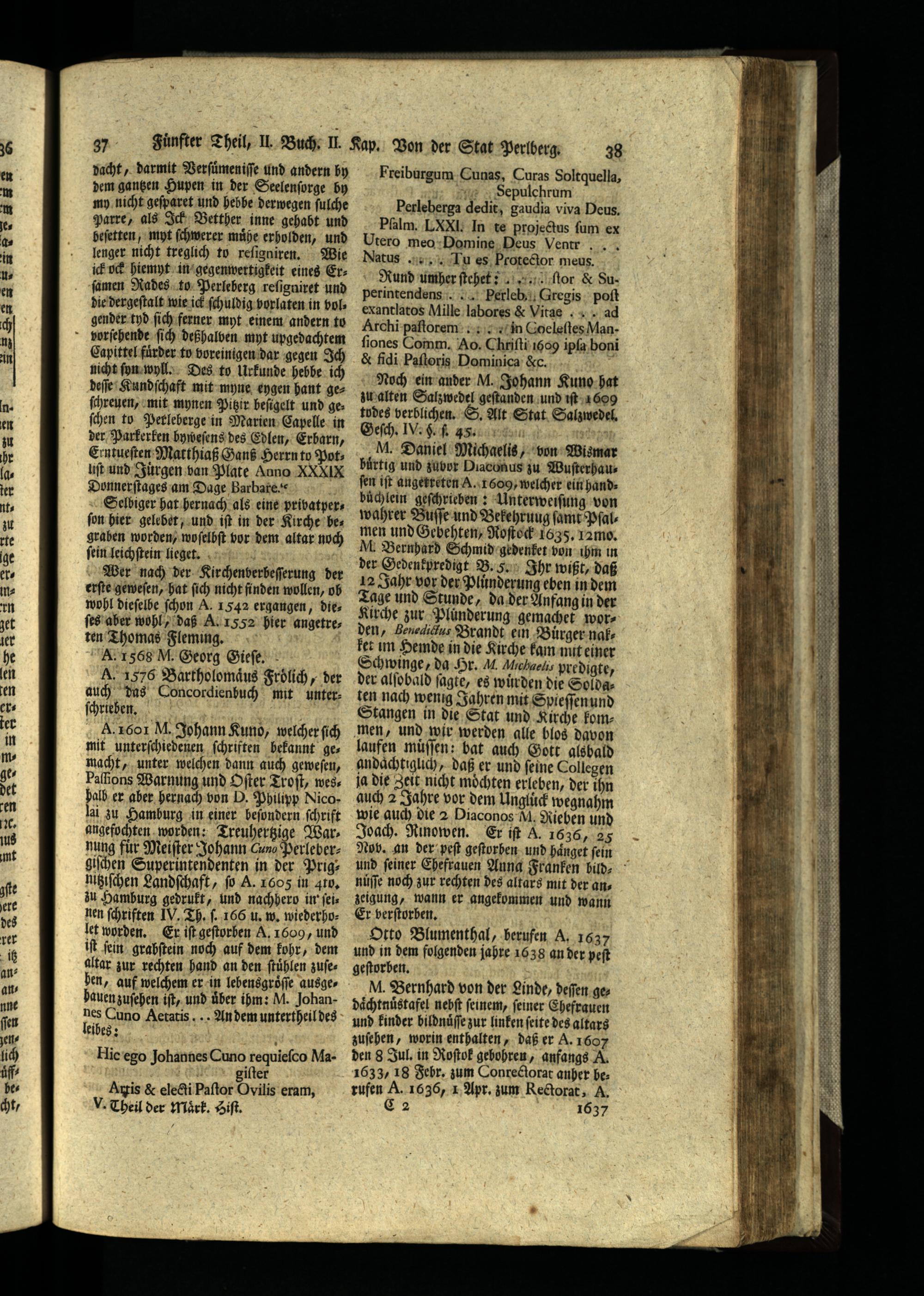 Ar 6οt. M. Johann Kuno, welcher ſich mit unterſchiedenen ſchriften bekannt ges macht, unter welchen dann auch geweſen, Pallions Warnung und Oſter Troſt, weshalb er aber hernach von D. Philipp Nicolai zu Hamburg in einer beſondern ſchrift angefochten worden: Treuhertzige War, nung für Meiſter Johann Cuno Perlebergiſchen Superintendenten in der Prignitziſchen Landſchaft, fo A. 1605 in zto. zu Hamburg gedrukt, und nachhero in ſei= nen ſchriften IV. Th. ſ. 166 u. w. wiederholet worden. Er iſt geſtorben A. 1609, und iſt ſein grabſtein noch auf dem kohr, dem altar zur rechten hand an den ſtuͤhlen zuſehen, auf welchem er in lebensgröͤſſe ausgehauen zuſehen iſt, und über ihm: M. Johannes Cuno Aetatis.. An dem untertheil des leihes: