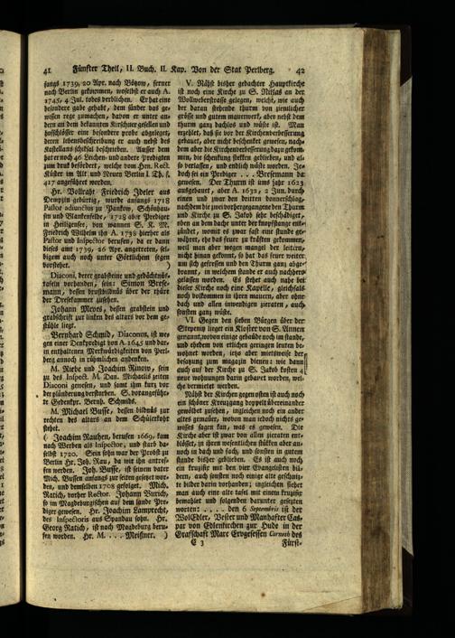 fangs 1739, 20 Apr. nach Bötzow, ferner nach Berlin gekotnmen, woſelbſt er auch A. 1745, 4 Jul. todes verblichen. Er hat eine beſondere gabe gehabt, dem ſuͤnder das gewiſſen rege zumachen, dabon er unter andern an dem bekannten Kirſchner geſellen und hoſſchloͤſſer eine beſondere probe abgelegt, deren lebensbeſchreibung er auch nebſt des Kaſtellans ſchikſal beſchrieben. Auſſer dem hat er noch 46 Leichen⸗ und andere Predigten zum druk befoͤrdert, welche vom Hrn. Reck. Kuͤſter im Alt und Neuen Berlin 1 Th. ſ. 417 angefuͤhret worden..