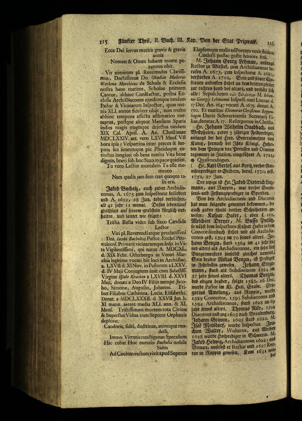 Viri pl. Reverendi atque preclariſſimi ni. Iacoßi Bucholzij Paſtor. Eecleſ. Pri walcenſ. Primarij vicinarumque Inſp. in Vita Vigilantiſſimi, qui natus A. MDCAL, d. XIX Febr. Oſterburgo in Veteri Marchia legitime vocati hic loci in Archidiac. a. XVII d. NI Nov. in Paſtorem a LXXV. d. IV Maji Conjugium iniit cum Selectiſſ. Virgine abe Kracten a XVIII. d. XXVlI Maſi, donati a Deo IV Filijs nempe Jacobo, Simone, Auguſto, Johanne. Lribus Filiabus Catharina, Lucia, Eliſabethæ. Denat. a M DCI XXXII. d. XXVIL Jan. h.