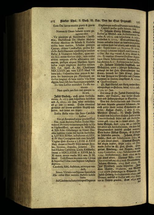 Werbena Marchicus de Schola& Eccleſia noſtra bene meritus, Scholae primum Cantor, abhine Gonkector, poſtea Eccleſie ArchiDiaconus ejusdemque tandem Paſtor& Vicinarum Inſpector, quae munia XI I annos fideliter obijt, non multo abhinc tempore affectu aſthmatico correptus, poſſque aliquot Menſium Spatia indies magis magisque dejectus tandem XIX Cal. April. A. Ae. Chriſtianae MCI XXIV. aet., vero LXVI Menf. Vll hora ipſa 5 Veſpertina inter preces& ſus piria{ua ſuorumque pie Placideque extinctus longiori ob bene merita Vita hene dignus, brevi ſub hoc Saxo in pace quieſcit. Tu vero Lector mortalem Le eſſe memento Nam qualis jam ſum cras quoque ta7 lis eris. Jakob Bucholz, auch zuvor Archidiaconus, A. 1675 zum Inſpectorat befördert und A. 1682, 28 Jan. todes berblichen, alt 41 jahr 1 monat. Deſſen lebenslauf gleichfals auf ſeinem grabſtein kurzlich enthalten, und lautet wie folget: J Triſtia Buſta vides ſub Saxo Candide or