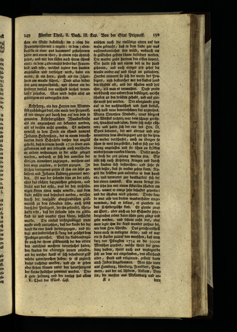 Kehrberg, ein den Herren von Winterfeld zuſtaͤndiges dorf, eine meile von Prizwalk, iſt vor einiger zeit durch den ruf von dem fo genanten Kehrbergiſchen Wunderkinde als ein angenehmer ort bekanter worden, als es vorhin nicht geweſen. Es wohnete nemlich in dem Dorfe ein ſchmid namens Johann Hohenſtein, der in einem benachbarten dorfe Schraͤpko vorher das ungluͤk gehabt, daß in ſeinem hauſſe 1730 feuer ausgekommen und mit ſelbigem auch verſchiede⸗˖ ne andere wohnungen in die aſche geleget worden, wodurch er ſich den unwillen der übrigen einwohner zugezogen, welchem aus dem wege zugehen, er hierher gezogen. In ſolchen verlegenen zeiten iſt ihm ein ſohn gebohren und Johann Ludwig genennet worden. Es war der ſiebende ſohn an der zahl, ohne das tochter darzwiſchen gebohren, und dieſes war das erſte, was bei den leichtſinnigen tern einen wahn erwekte, aus dem kinde muͤßte was beſonders werden, welcher durch der taufgaͤſte aberglaubiſchen gluͤk, wunſch zu dem ſiebenden ſohn, auch ſelbſt durch des Predigers, der ihn getaufet, ſcherzhafte rede, daß der ſiebende ſohn ein gluͤkskind ſei und wunder thun koͤnne, beſtaͤrket wurde. Die einfalt leichtglauͤbiger leute wuſte auch zuerzehlen, daß der knabe bei der taufe die eine hand hervorgezogen, und ſelbige mit ſonderlicher fi. lung des geſichts dem Prediger gereichet. Weil die kindtaufengaͤſte auch bei ihrem gluͤkwunſch bei den eltern den entſchlus mochten verurſachet haben, den knaben die chirurgie lernen zulaſſen, als bei welcher kunſt er ſich beſonderes gluͤk wuͤrde zuverſprechen haben: ſo iſt zugleich dieſes ruchtbar worden, und ehe er gehen oder ſtehen koͤnnen unter den bauerjungens der kleine Feldſcher genennet worden. Dieſe gute hofnung und der vorſatz hat allem V. Theil der Maͤrk. Hiſt.