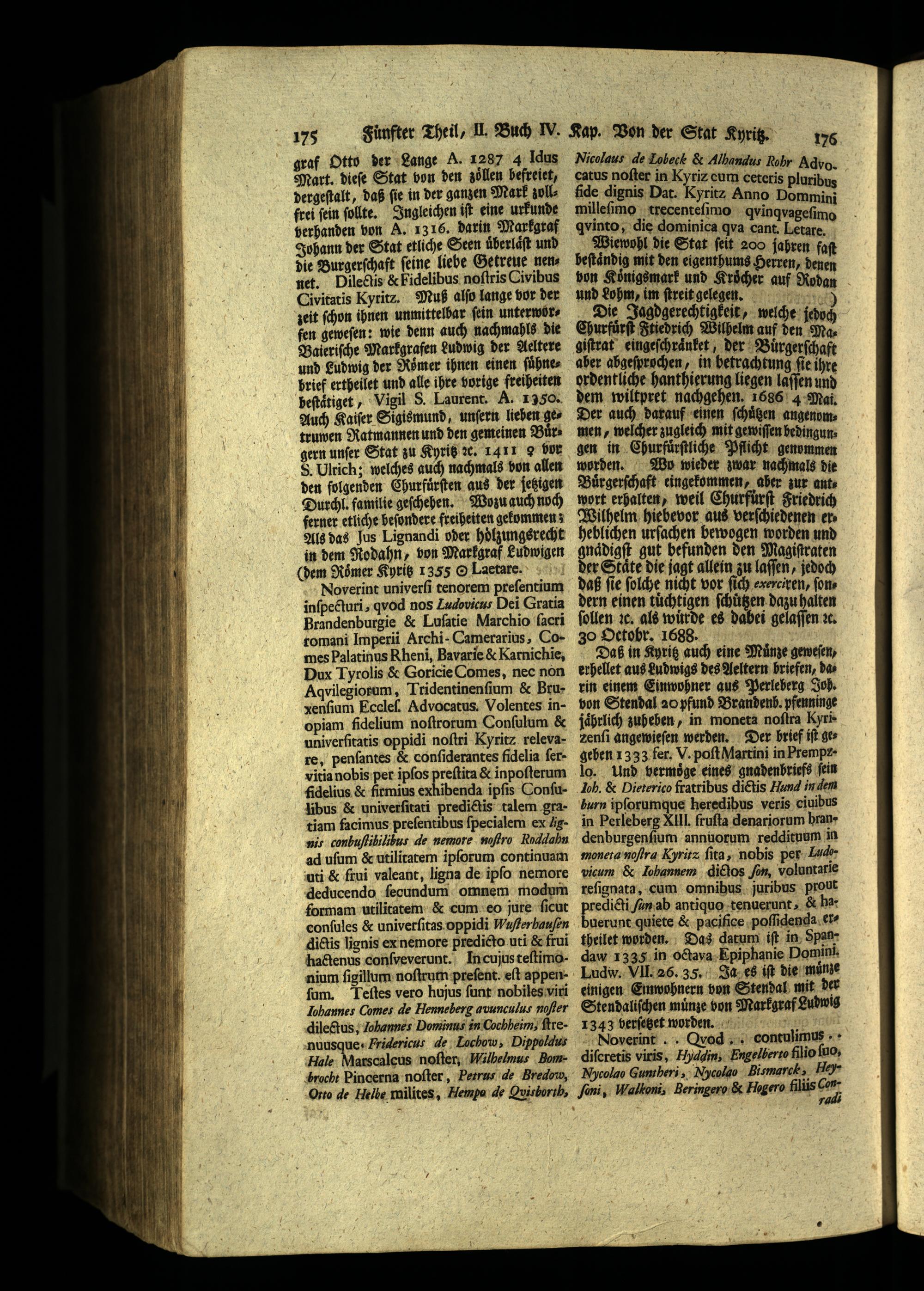 Kap. Von der Stat Kyritz. 176 Nicolaus de Tobeck& Alhandus Rohr Advo catus noſter in Kyriz cum ceteris pluribus fide dignis Dat. Kyritz Anno Dommini milleſimo trecenteſimo qvinqvageſimo qvinto, die dominica qua cant. Letare.
