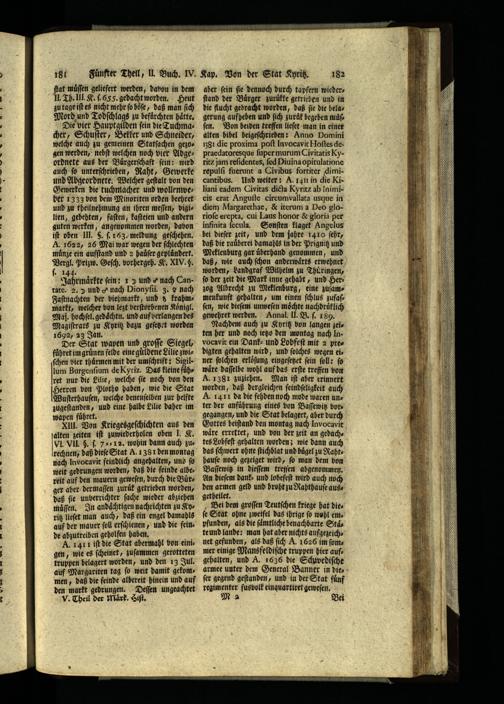 zu tage iſt es nicht mehr ſo boͤſe, daß man ſich Mord und Todſchlags zu befürchten hätte, Die vier Hauptgilden ſein die Tuchmacher, Schuſter, Bekker und Schneider, welche auch zu gemeinen Statſachen gezogen werden, nebſt welchen noch vier Abgeordnete aus der Buͤrgerſchaft ſein: wird auch ſo unterſchrieben, Raht, Gewerke und Abgeordnete. Welcher geſtalt von den Gewerken die tuchmacher und wollenweber 1333 von dem Minoriten orden beehret und zu theilnehmung an ihren meſſen, vigilien, gebehten, faſten, kaſteien und andern guten werken, angenommen worden, davon iſt oben III.§5. ſ. 163. meldung geſchehen. A. 1622, 26 Mai war wegen der ſchlechten muͤnze ein aufſtand und 2 hauͤſer geplündert. Vergl. Prizw. Geſch. vorhergeh. K. XIV.§. EL Jahrmaͤrkte fein: x> und«nach Cantate. 2.) und 9 nach Dionyſii. 3. 0 nach Faſtnachten der viehmarkt, und 5 krahmmarkt, welcher von lezt verſtorbenen Koͤnigl. Maß. hochſel. gedaͤchtn. und auf verlangen des Magiſtrats zu Kyritz dazu geſetzet worden 1692, 23 Jan.. Der Stat wapen und groſſe Siegel, fuͤhret im gruͤnen felde eine guͤldene Lilie zwiſchen vier thuͤrmen mit der umſchrift: Sigillum Burgenſium de Kyriz. Das kleine fuͤhret nur die Lilie, welche ſie noch von den Herren von Plotho haben, wie die Stat Wuſterhauſen, welche denenſelben zur helfte zugeſtanden, und eine halbe Lilie daher im wapen fuͤhret.— XIII. Von Kriegesgeſchichten aus den alten zeiten iſt zuwiederholen oben J. K. Vl. VIL 5. ſ. 2 12. wohin dann auch zus rechnen, daß dieſe Stat A. 1 381 den montag nach lnvocavit feindlich angehalten, und fo weit gedrungen worden, daß die feinde albereit auf den mauern geweſen, durch die Buͤrger aber dermaſſen zurüf getrieben worden, daß ſie unberrichter ſache wieder abziehen muͤſſen. In andaͤchtigen nachrichten zu Kyritz lieſet man auch, daß ein engel damahls auf der mauer ſoll erſchienen, und die feinde abzutreiben geholfen haben. 6. A. 1411 iſt die Stat abermahl bon einigen, wie es ſcheinet, zuſammen gerotteten truppen belagert worden, und den 13 Jul. auf Margariten tag ſo weit damit gekommen, daß die feinde albereit hinein und auf den markt gedrungen. Deſſen ungeachtet