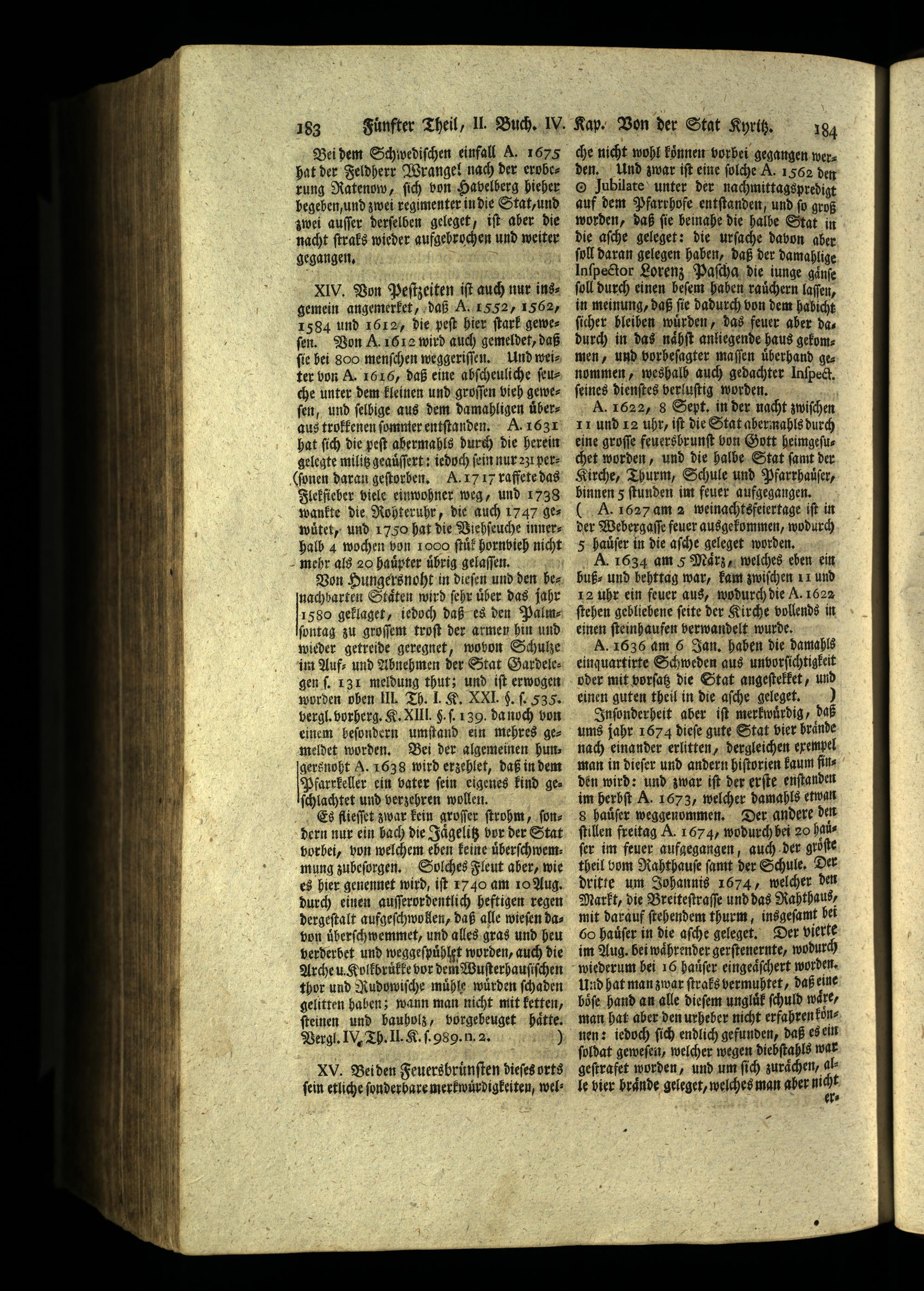 XIV. Von Peſtzeiten iſt auch nur insgemein angemerket, daß A. 1552, 1562, 1584 und 1612, die peſt hier ſtark gewefer. Von A 1612 wird auch gemeldet, daß fie bei oo menſchen weggeriſſen. Und weiter von A. 1616, daß eine abſcheuliche ſeuche unter dem kleinen und groſſen vieh gewefen, und ſelbige aus dem damahligen uͤberaus trokkenen ſommer entſtanden. A. 1631 hat(ich die peſt abermahls durch die herein gelegte militz geauſſert: iedoch fein nur zt per