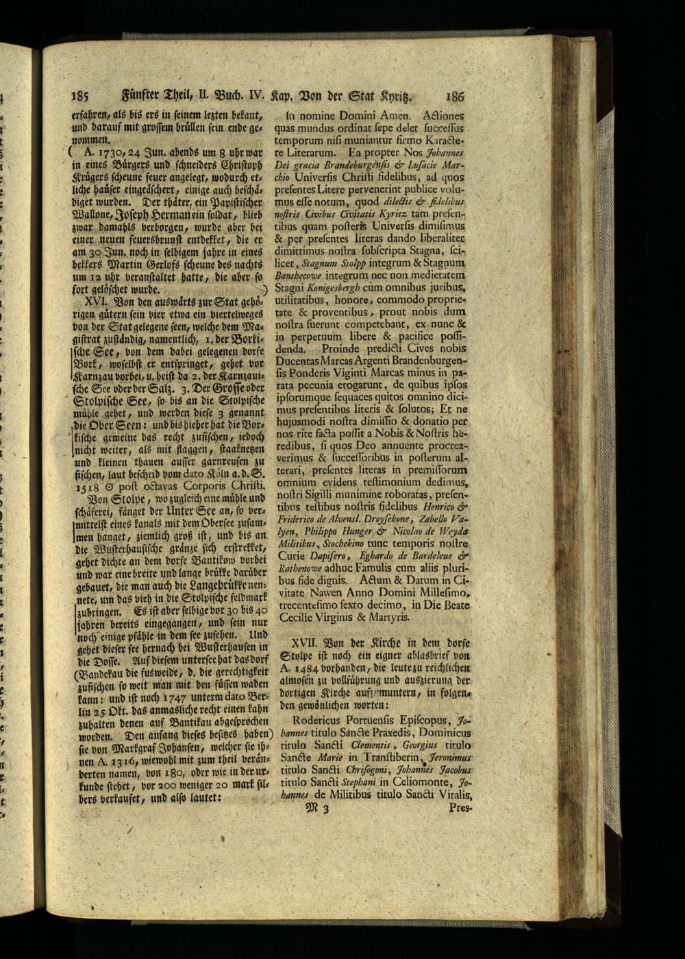 erfahren, als bis ers in feinem lezten bekant, ln nomine Domini Amen. Adiones und darauf mit groſſem hruͤllen ſein ende ges quas mundus ordinat ſepe delet ſucceſſus nommen. temporum niſi muniantur firmo Karacte( A. 1730, 24, Jun. abends um 8 uhr war re Literarum. Ea propter Nos Johannes in eines Bürgers und ſchneiders Chriſtoph Dei gracia Brandeburgenſis& Luſucie MarKruůͤgers ſcheune feuer angelegt, wodurch et⸗ chio Univerſis Chriſti fidelibus, ad quos liche hauſer eingeaͤſchert, einige auch beſchaͤ⸗ preſentes Litere pervenerint publice voludiget wurden. Der thaͤter, ein Papiſtiſcher mus eſſe notum, quod dilectic& fidelibus Wallone, Joſeph Herman ein ſoldat, blieb noſtriſ Civibus Civitatis Kyritz tam preſenzwar damahls verborgen, wurde aber hei tihus quam poſteris Univerſis dimiſimus einer neuen feuershrunſt entdekket, die er& per preſentes literas dando liberaliter am 30 Jun. noch in ſelbigem jahre in eines dimittimus noſtra ſubſcripta Stagna, ſcibekkers Martin Gerlofs ſcheune des nachts licet, Stagnum Stolpp integrum& Stagnum um 12 uhr veranſtaltet hatte, die aber fo Banthecome integrum nec non medietatem fort geloͤſchet wurde.) Stagni Konigesbergh cum omnibus juribus, ; XVI. Von den auswaͤrts zur Stat gehö⸗ utilitatibus, honore, commodo proprie; rigen gütern fein vier etwa ein viertelweges tate& proventibus, prout nobis dum von der Stat gelegene ſeen, welche dem Mas noſtra fuerunt competebant, ex nunc& giſtrat zuſtaͤndig, namentlich, 1. der Borki⸗ in perpetuum libere& pacifice poffi{de See, von dem dabei gelegenen dorfe denda. Proinde predicti Cives nobis Bork, woſelbſt er entſpringet, gehet vor Ducentas Marcas Argenti BrandenburgenKarnzau vorbei, un, heiſt da 2. der Karnzaui- ſis Ponderis Viginti Marcas minus in Pa{che See oder der Salz. 3. Der Groſſe oder rata pecunia erogarunt, de quibus ipfos Stolpiſche See, ſo bis an die Stolpiſche ipſorumque fequaces quitos omninq dici. mühle gehet, und werden dieſe genannt mus preſentibus literis& ſoluros; Et ne die Ober Seen: und bis hieher hat die Bor, hujusmodi noftra dimiſſio& donatio per kiſche gemeine das recht zufiſchen, iedoch nos rite facta poſſit a Nobis& Noſtris henicht weiter, als mit flaggen, ſtaaknetzen redibus, fi nos Deo annuente procrenund kleinen thauen auſſer garnreuſen zu verimus& lucceſſoribus in pofterum al. fiſchen, laut beſcheid vom dato Köln a. d. S. terari, preſentes literas in premiſſorum 1518& poſt octavas Corporis Chriſti. omnium ‚evidens teſtimonium dedimus, Von Stolpe, wo zugleich eine mühle und noſtri digilli munimine roboratas, preſen· ſchaͤferei, fänget der Unter See an, ſo ver, tibus teſtibus noſtris fidelibus Henrico& mit telſt eines kanals mit dem Oberſee zuſam, Friderico de Alvenst, Droyfekone, Zabello Pamen hanget, ziemlich groß iſt, und bis an hen, L bhilihpo Hunger& Nicolas de Weyda die Wuſterhauſiſche graͤnze ſich erſtrekket, Militibus, Stochekino tunc temporis noſtre gehet dichte an dem dorfe Bantikom vorbei Curie Dapifero, Kahardo de Bardelene& Und war eine breite und lange bruͤkke darüber Läartheng e adhuc Famulis Cum aliis plurigebauet, die man auch die Langebruͤlke nen, bus fide dignis Actum& Datum in Ci. nete, um das vieh in die Stolpiſche feldmark Hate Nawen Anno Domini Milleſimo, zubringen. Es ift aher felbige vor 30 bis 40 3 ſexto decimo, in Die Beate jahren bereits eingegangen, und fein nur Cecilie Virginis& Martyris. noch einige pfaͤhle in dem fee zuſehen. Und.. het diefer fee hernach bei Wuſterhauſen in XVII. Bon der Kirche in dem dorfe die Doſſe. Auf dieſem unterſee hat das dorf Stolpe iſt noch ein eigner ablashrief von* (Bandekau die fusweide, d. die gerechtigkeit 1484 vorhanden, die leute zu reichlichen zufſchen fo weit man mit den füſſen waden almoſen zu vollfuͤhrung und auszierung der kann: und iſt noch 1747 unterm dato Ber- dortigen Kirche aufzmuntern, in folgenlin 25 Okt. das anmasliche recht einen kahn den gewänlichen worten: zuhalten denen auf Bantikau abgeſprochen Rodericus Portuenſis Epiſcopus,
