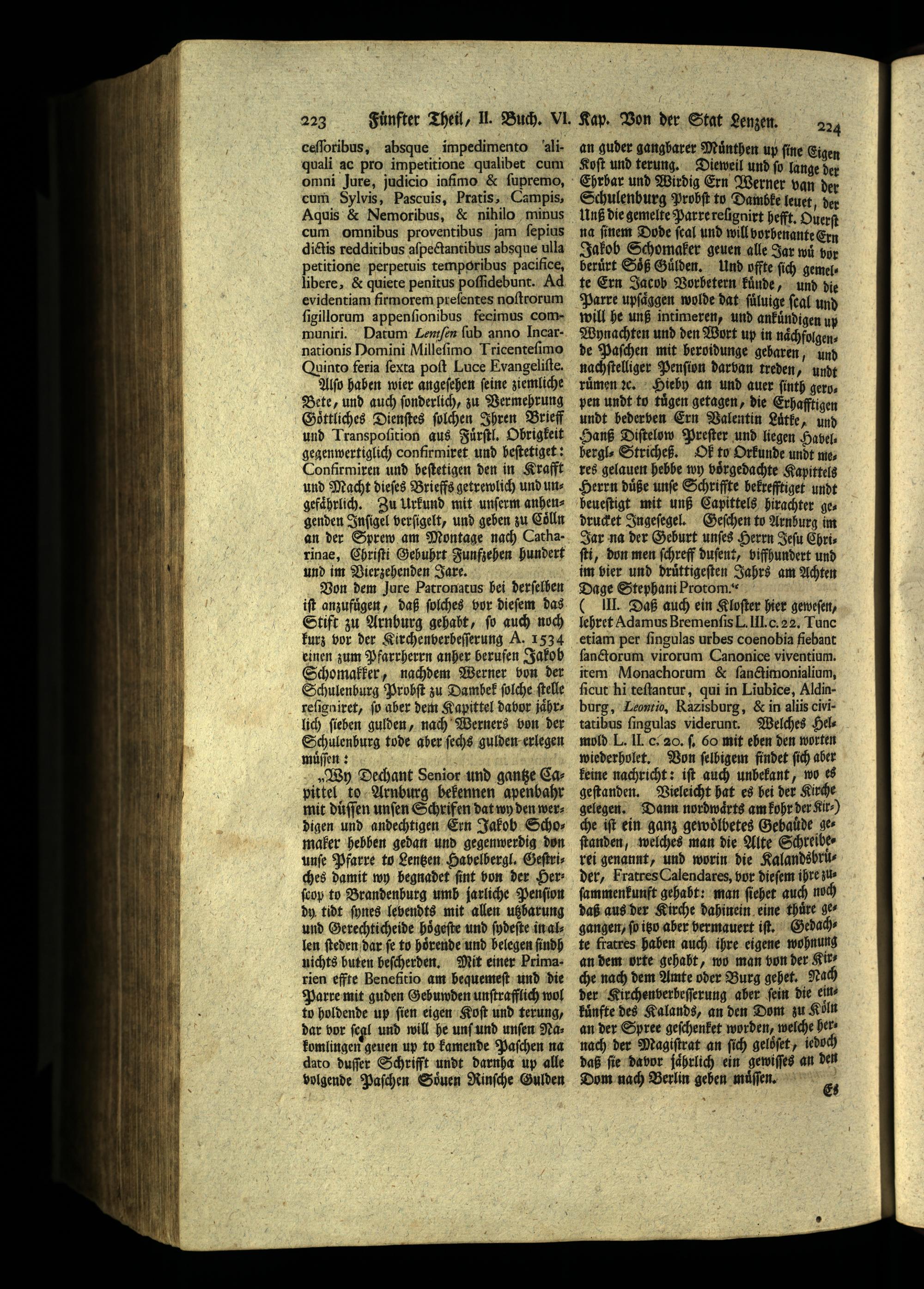 „Wy Dechant Senior und gantze Capittel to Arnburg bekennen apenbahr mit duſſen unſen Schrifen dat wy den werdigen und andechtigen Ern Jakob Schomaker hebben gedan und gegenwerdig don unſe Pfarre to Lentzen Havelbergl. Geſtriches damit wy begnadet ſint won der Her: ſcop to Brandenburg umb jarliche Penſion dy tidt ſynes lebendts mit allen utzbarung und Gerechticheide höͤgeſte und ſydeſte in allen ſteden dar ſe to hoͤrende und belegen ſindh nichts buten beſcherden. Mit einer Primarien effte Benefitio am bequemeſt und die Parre mit guden Gebuwden unſtrafflich wol to holdende up ſien eigen Koſt und terung, dar vor ſegl und will he unſ und unſen Nakomlingen geuen up to kamende Paſchen na dato duſſer Schrifft undt darnha up alle volgende Paſchen Suen Rinſche Gulden