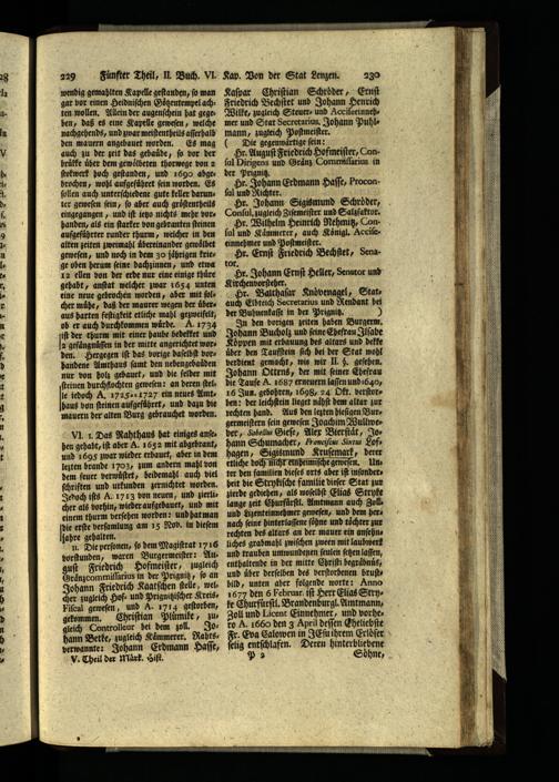 n. Die perſonen, fo dem Magiſtrat 1716 vorſtunden, waren Burgermeiſter: Auguſt Friedrich Hofmeiſter, zugleich raͤnzcommiſſarius in der Prignitz ſo an Johann Friedrich Kaatſchen ſtelle, wel Jer zugleich Hof und Prignitziſcher KreisFiſcal geweſen, und A. 1714 geſtorben, gekommen. Chriſtian Plümike, zus gleich Controlleur bei dem zoll. Johann Betke, zugleich Kämmerer, Rahtsverwannte: Johann Erdmann Haſſe,